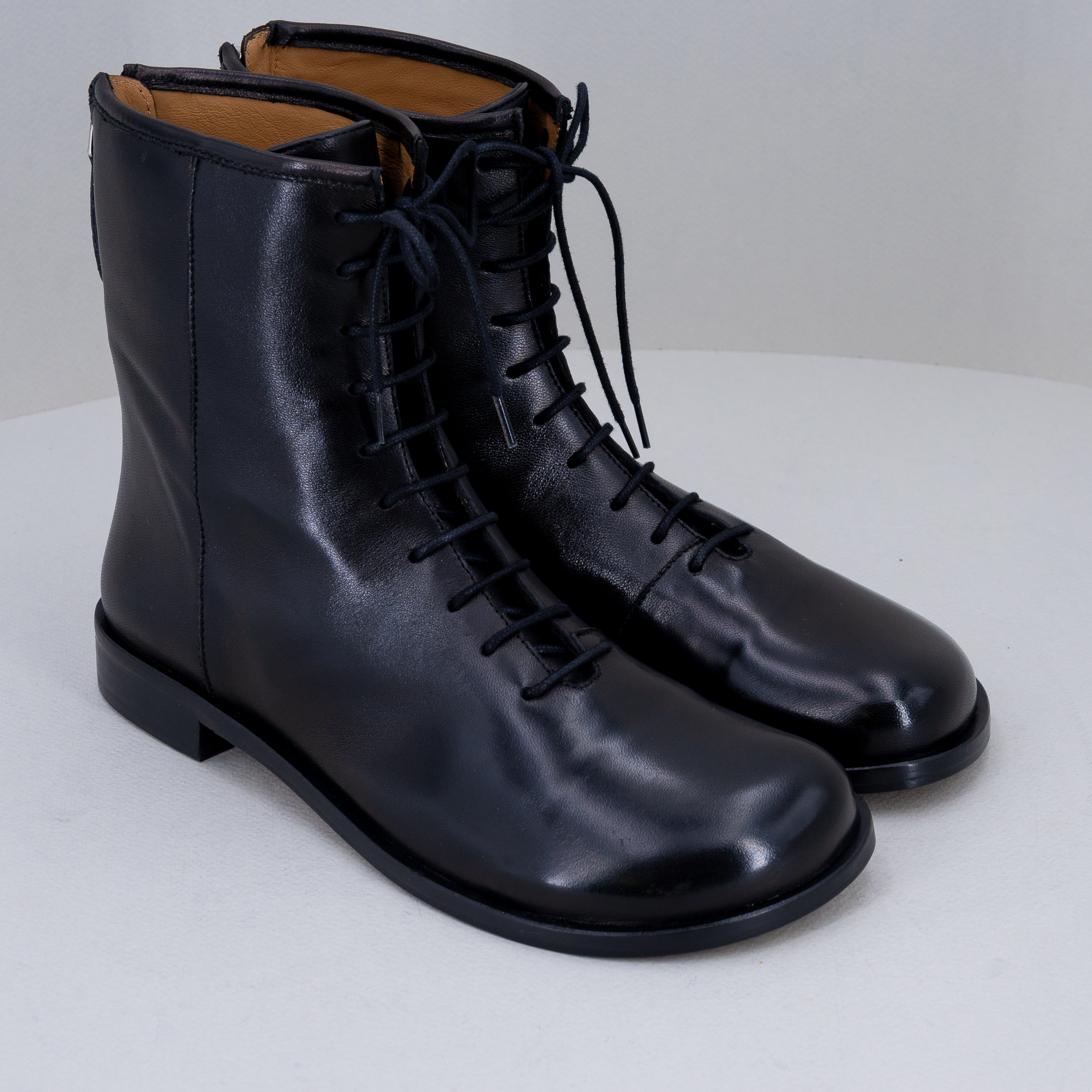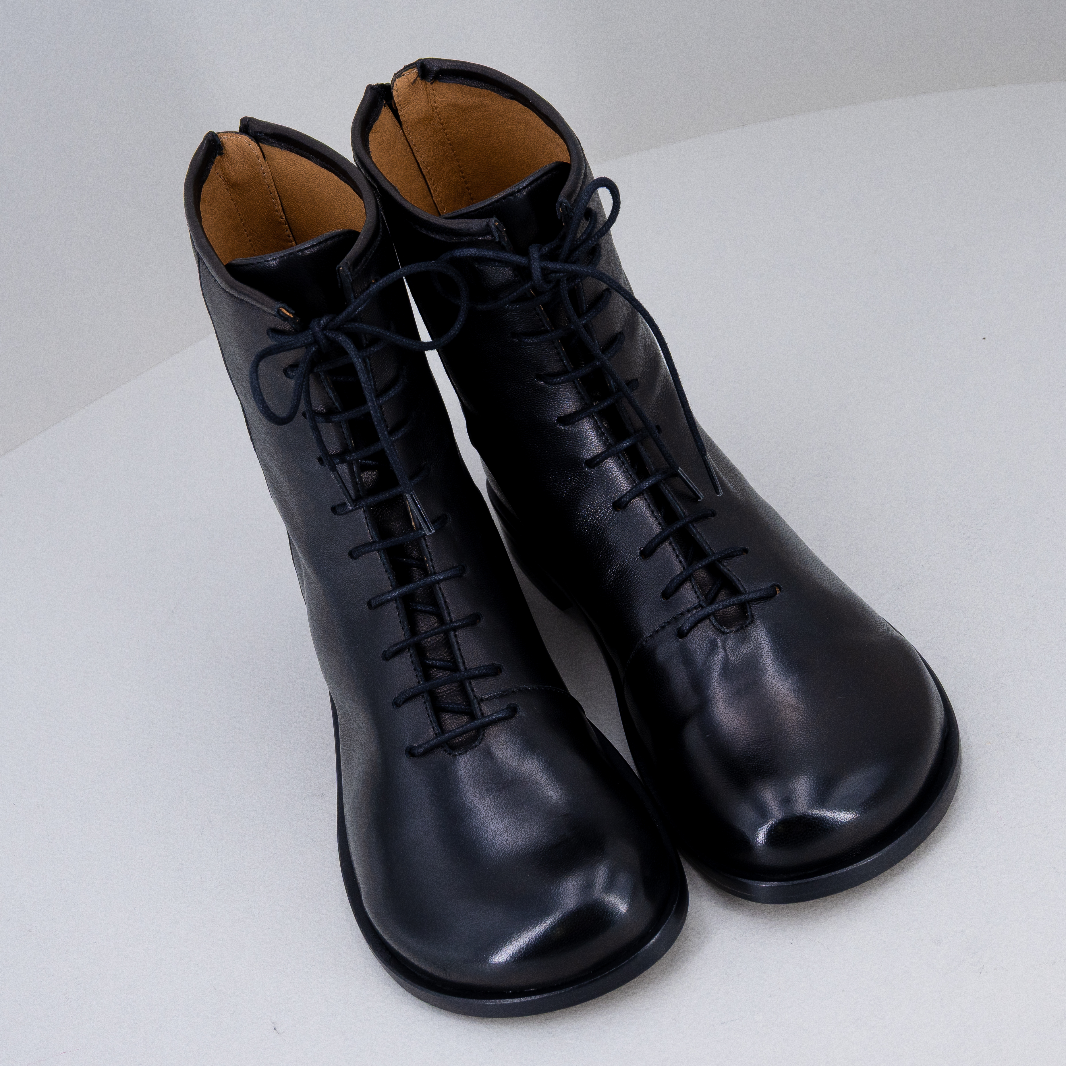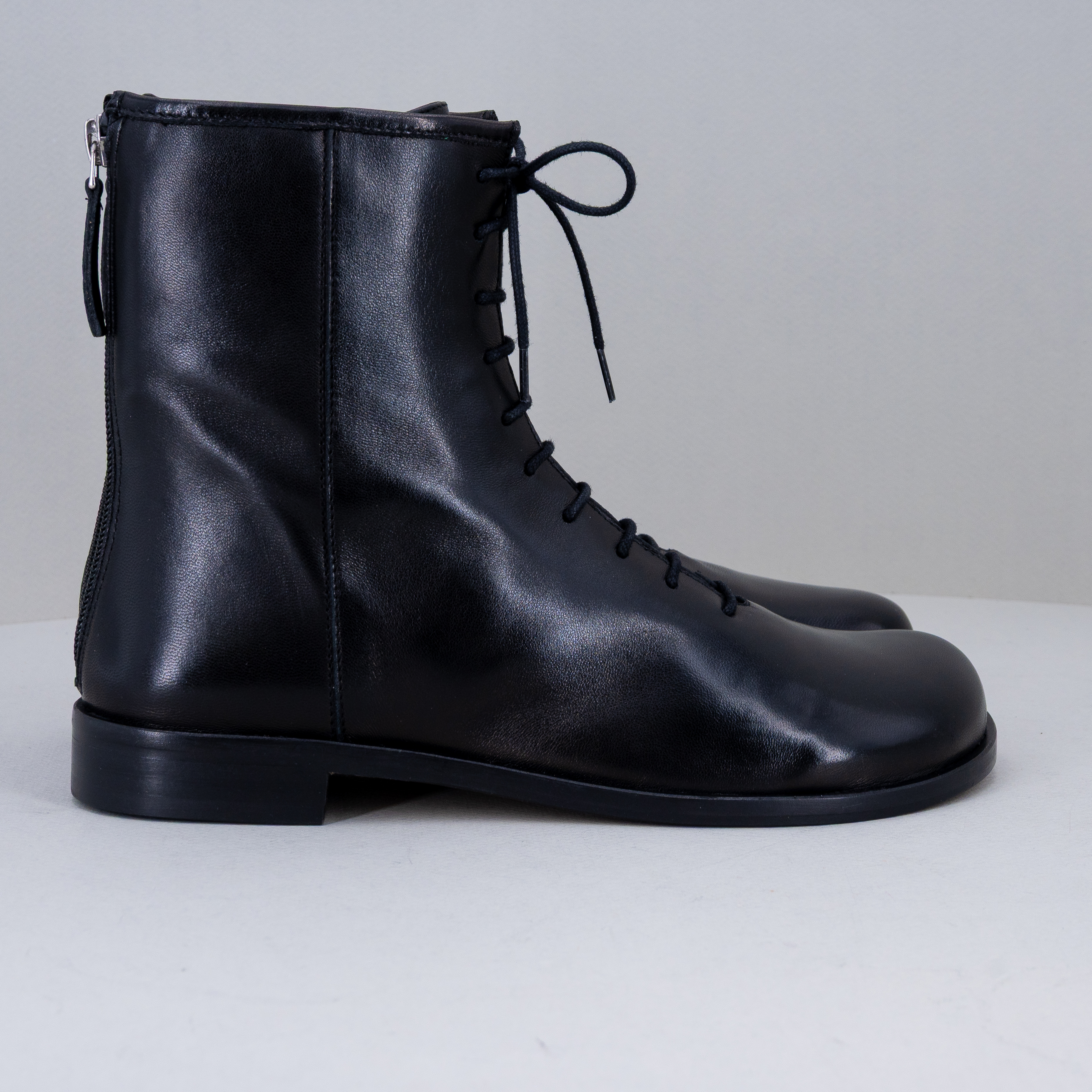 Audley stivaletto in vera e pregiata pelle con tacco basso, zip e lacci stile anfibio.