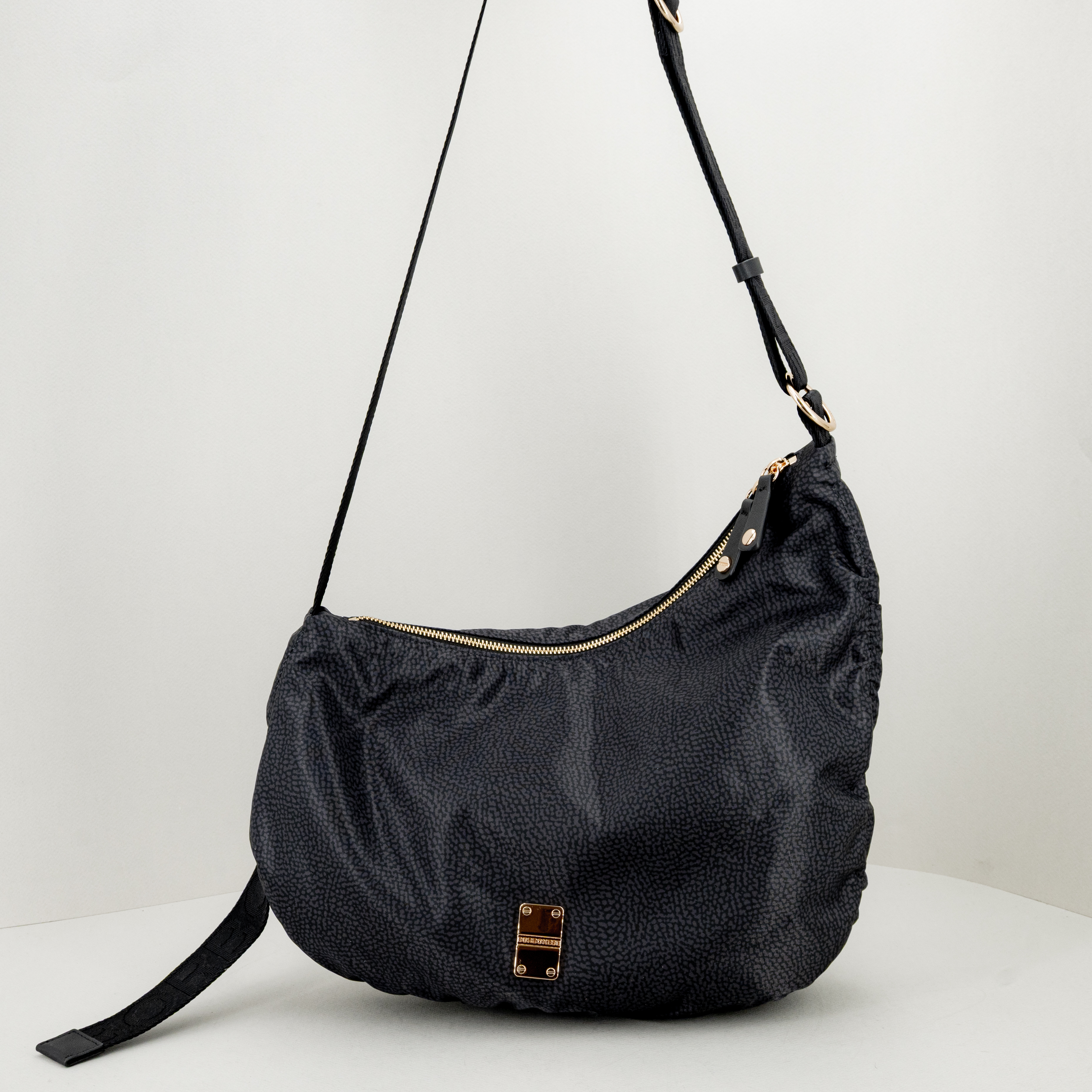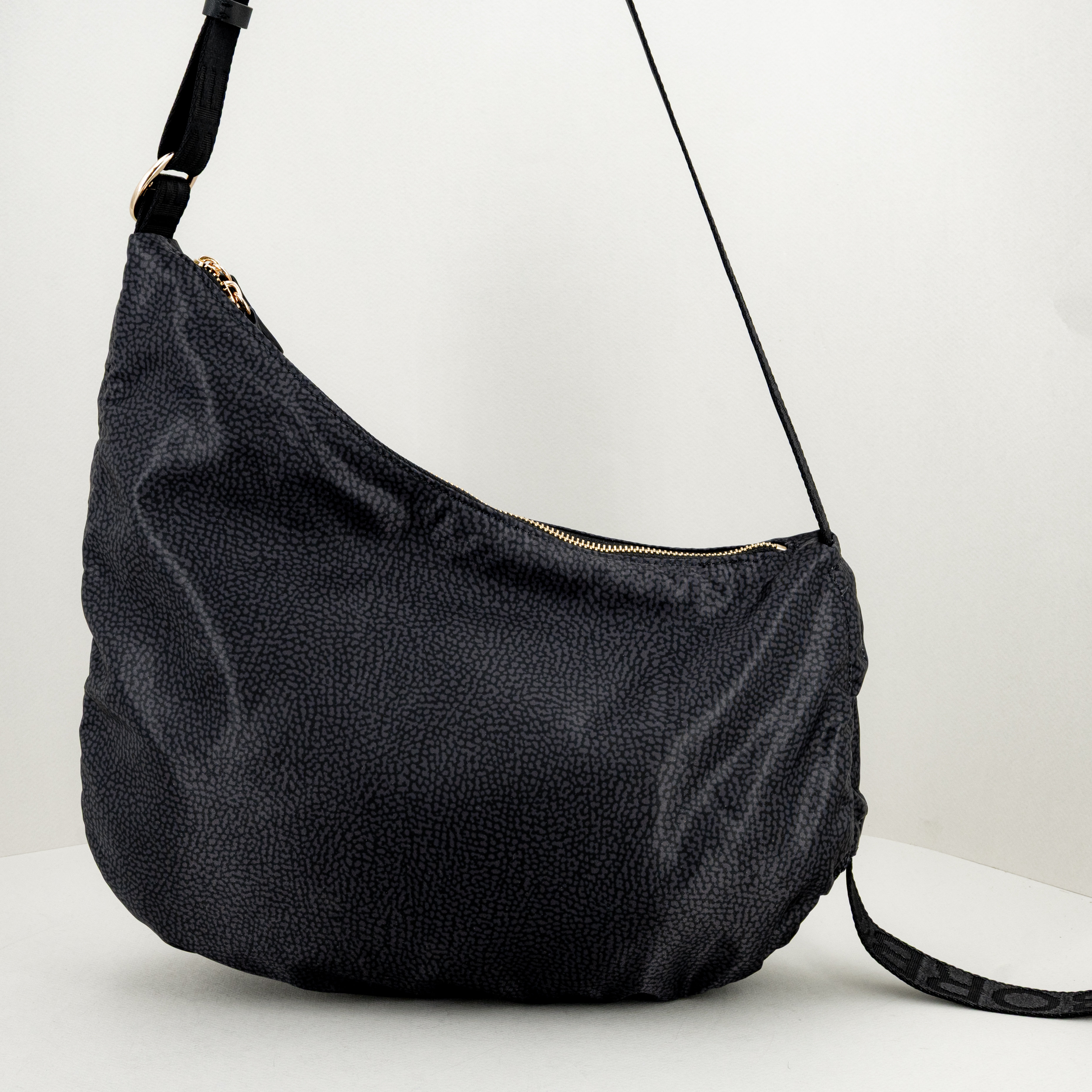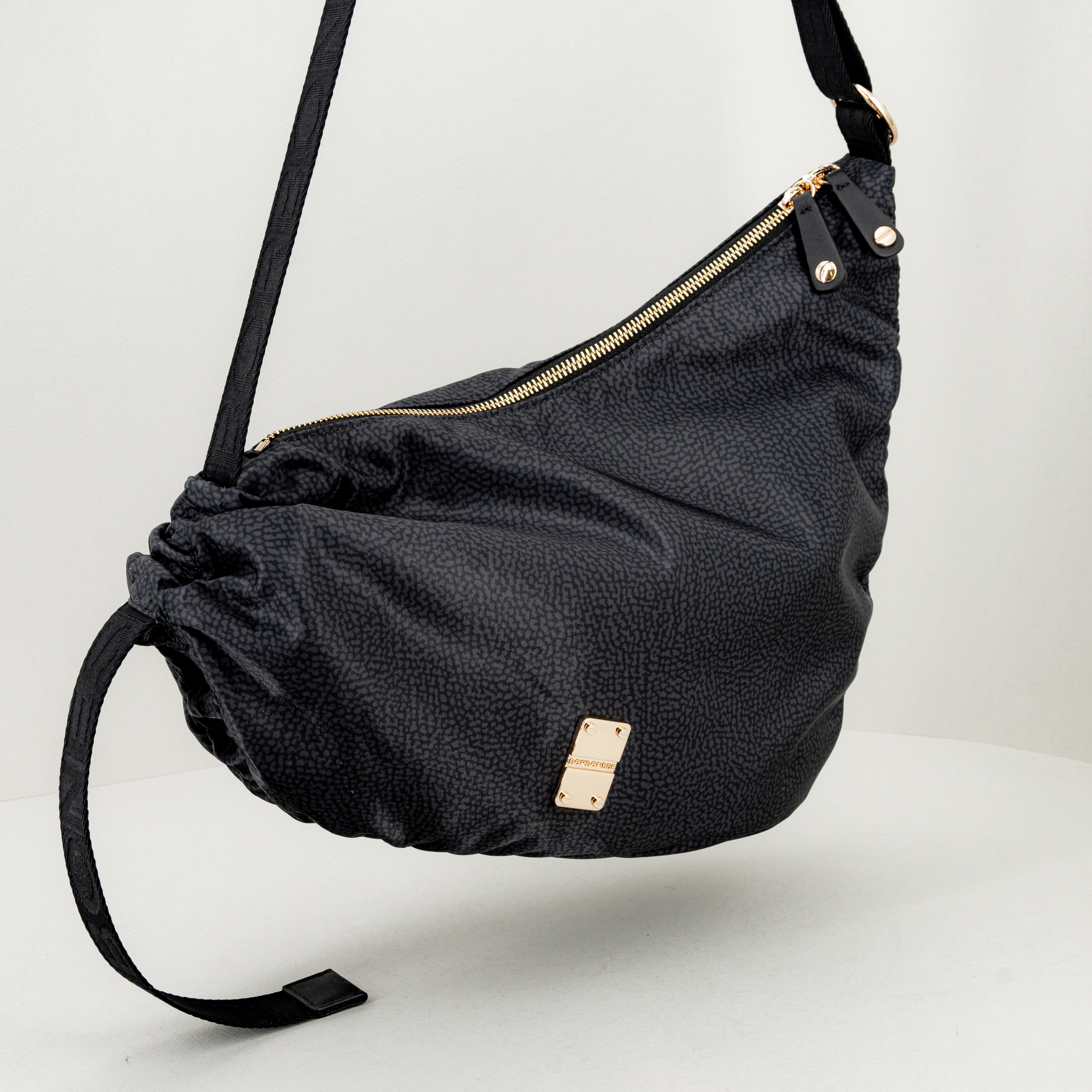 La nuova borsa donna Borbonese cross over in nylon ecosostenibile e pelle colore nero ha una forma particolare e un design dalle linee pulite.