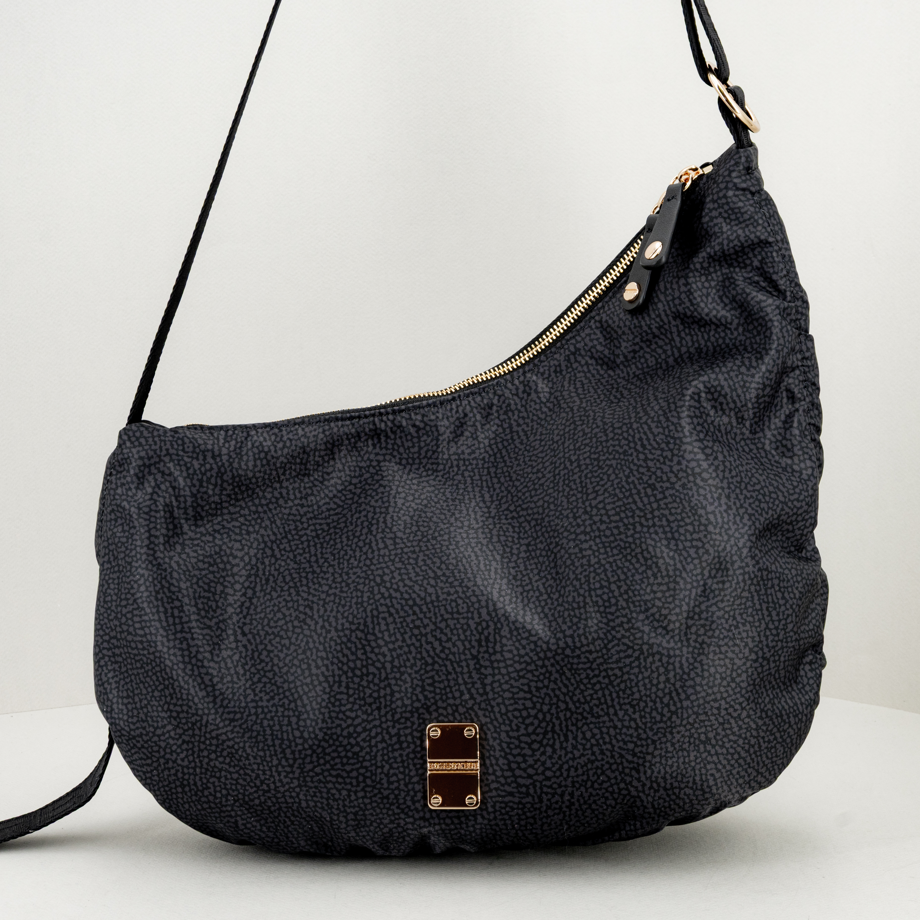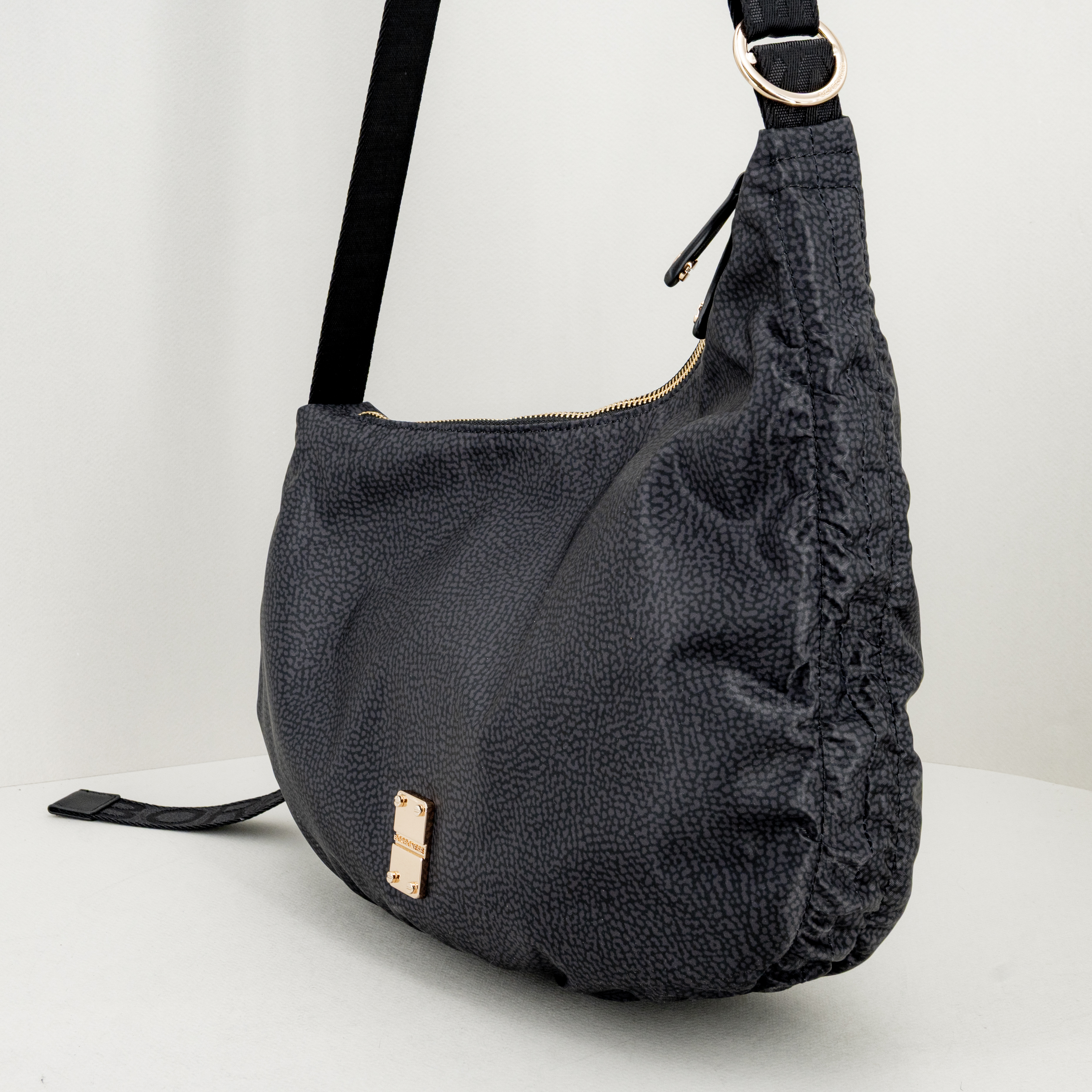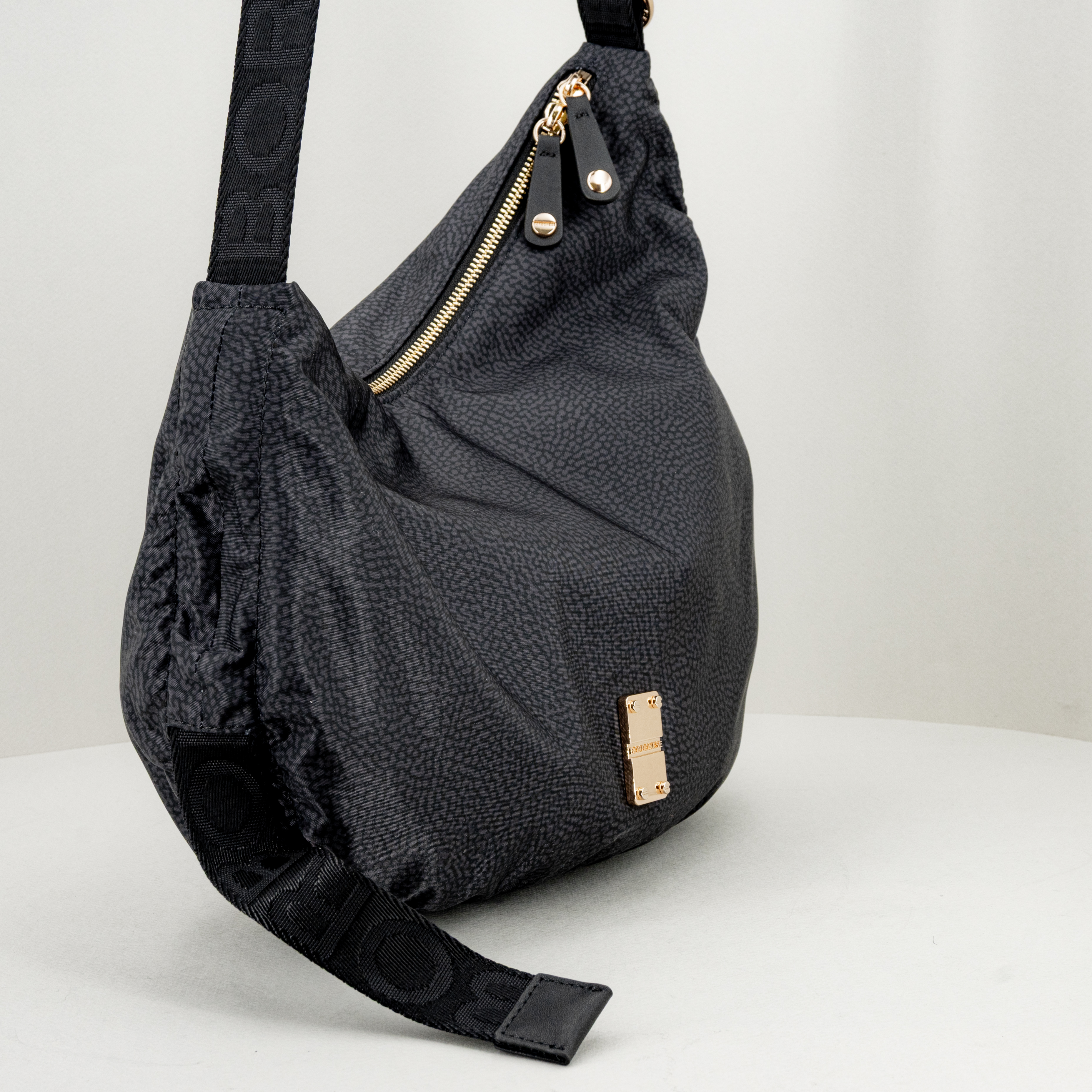 La nuova borsa donna Borbonese cross over in nylon ecosostenibile e pelle colore nero ha una forma particolare e un design dalle linee pulite.