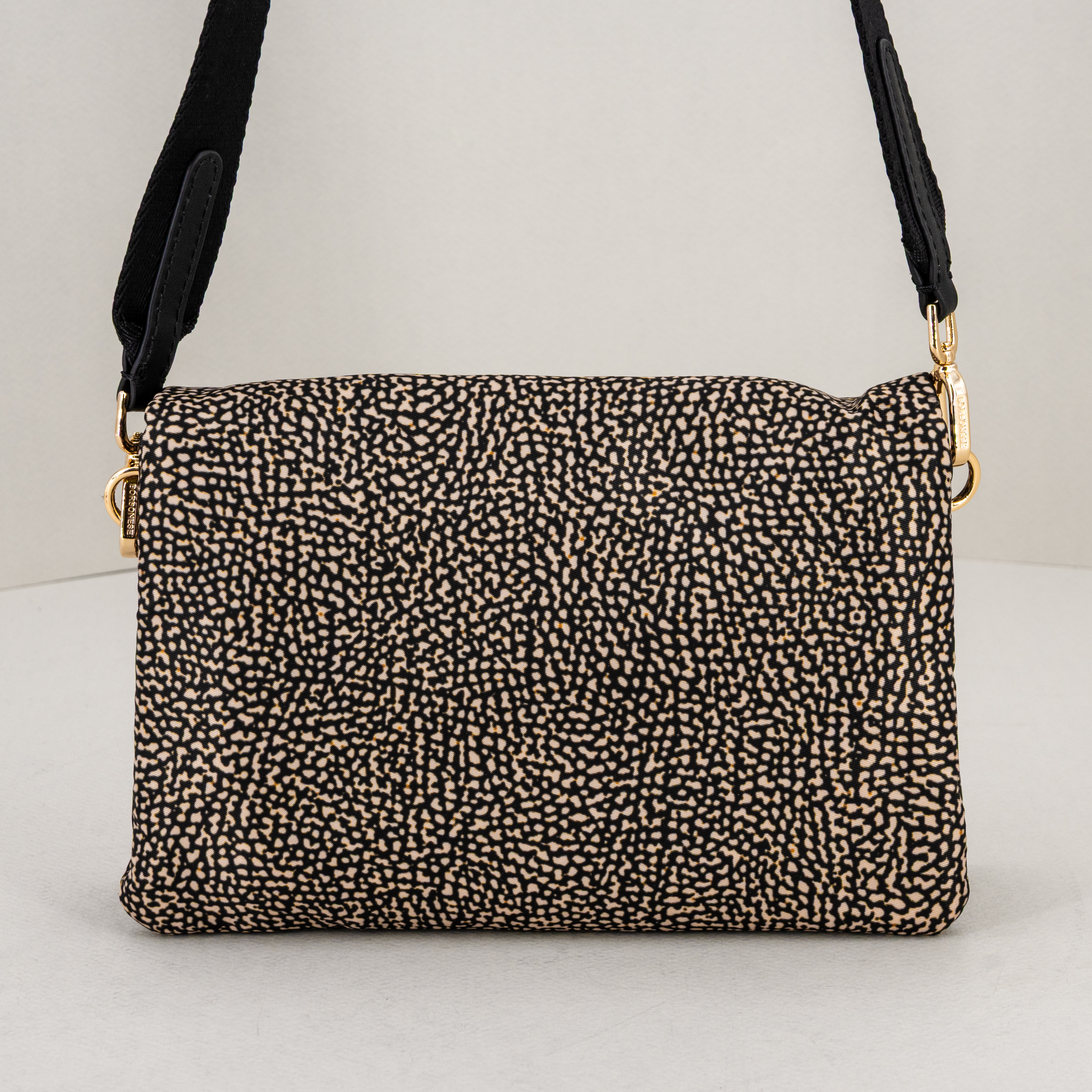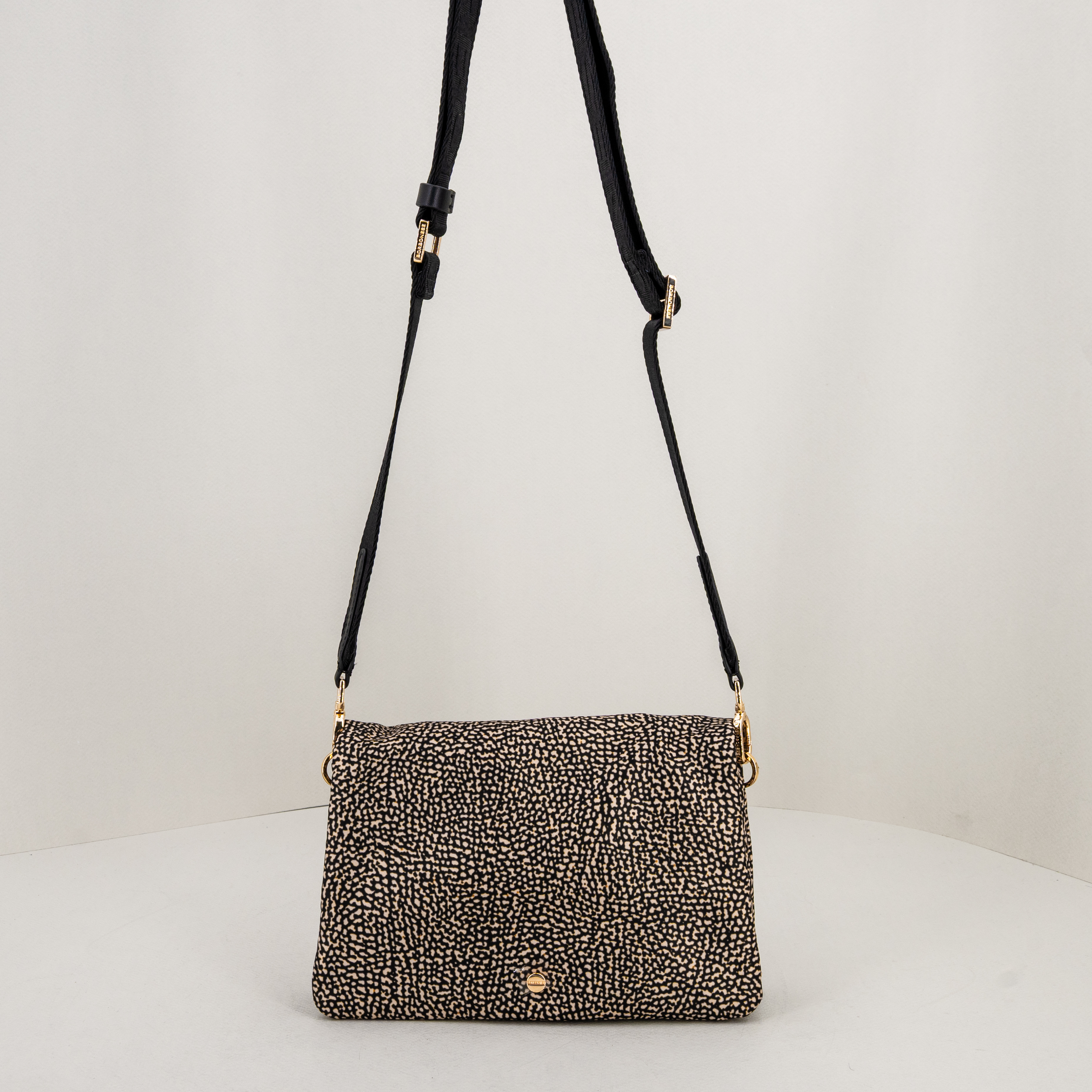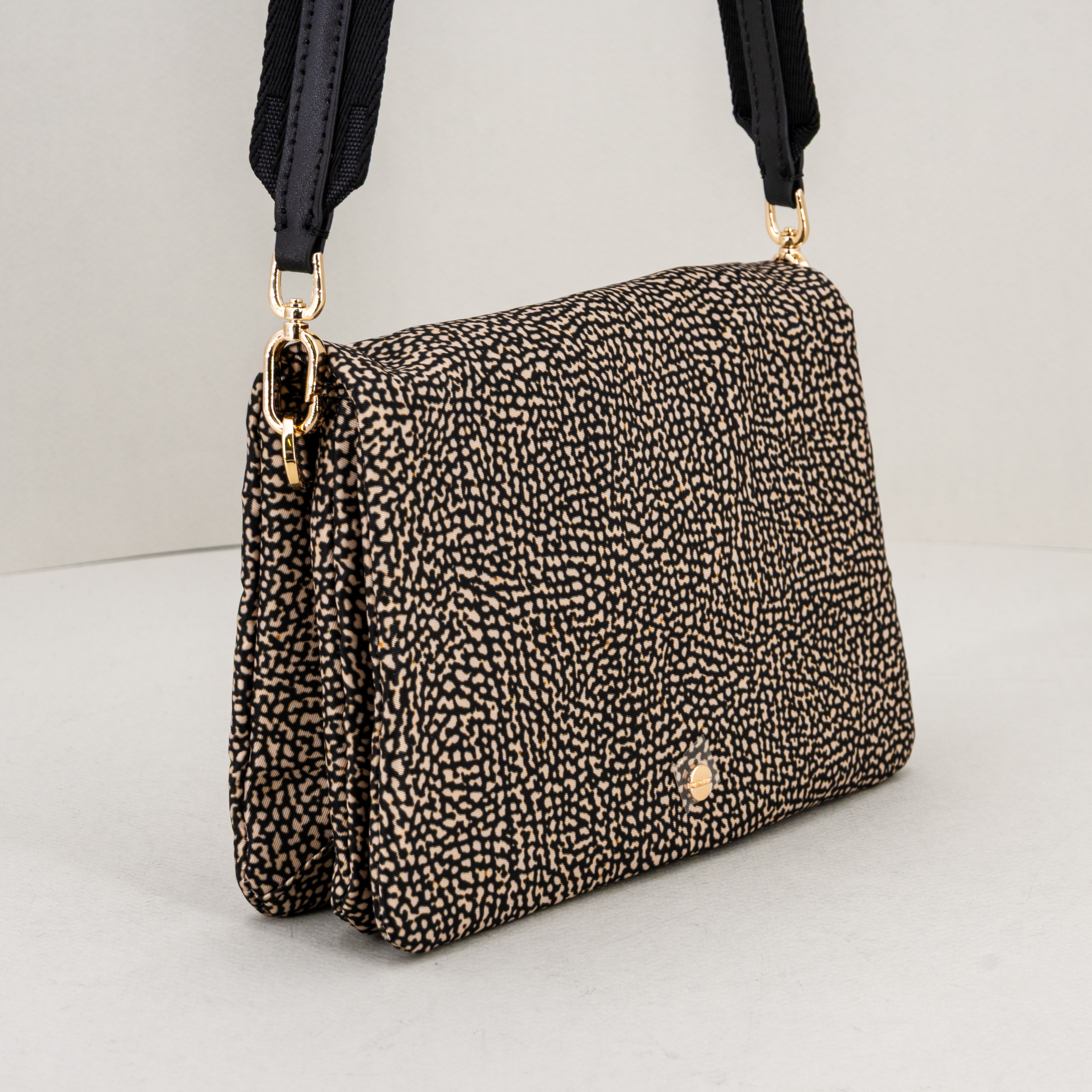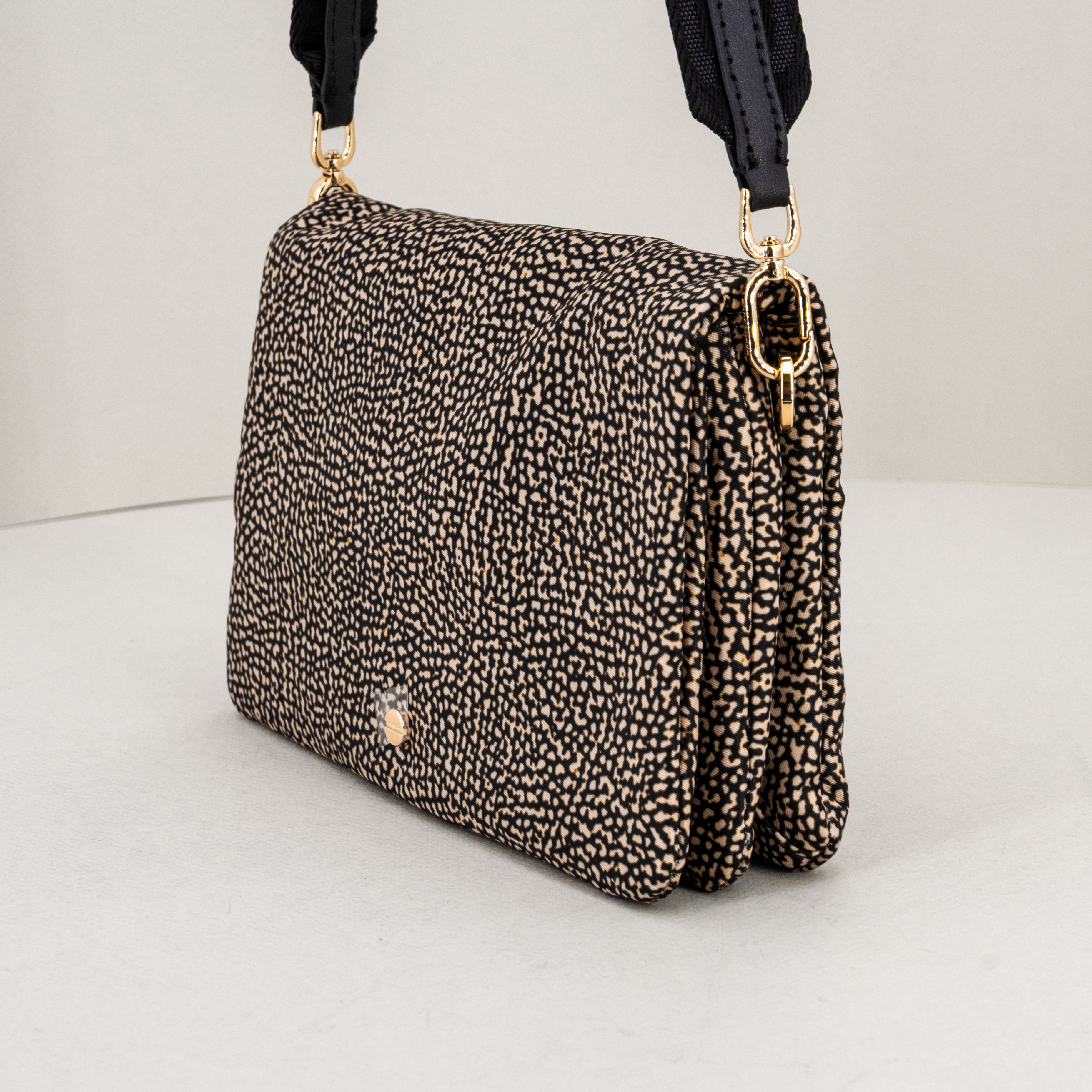 Realizzata in tessuto op riciclato, ha la patta che si chiude con bottone magnetico e la tracolla in tessuto logato regolabile.