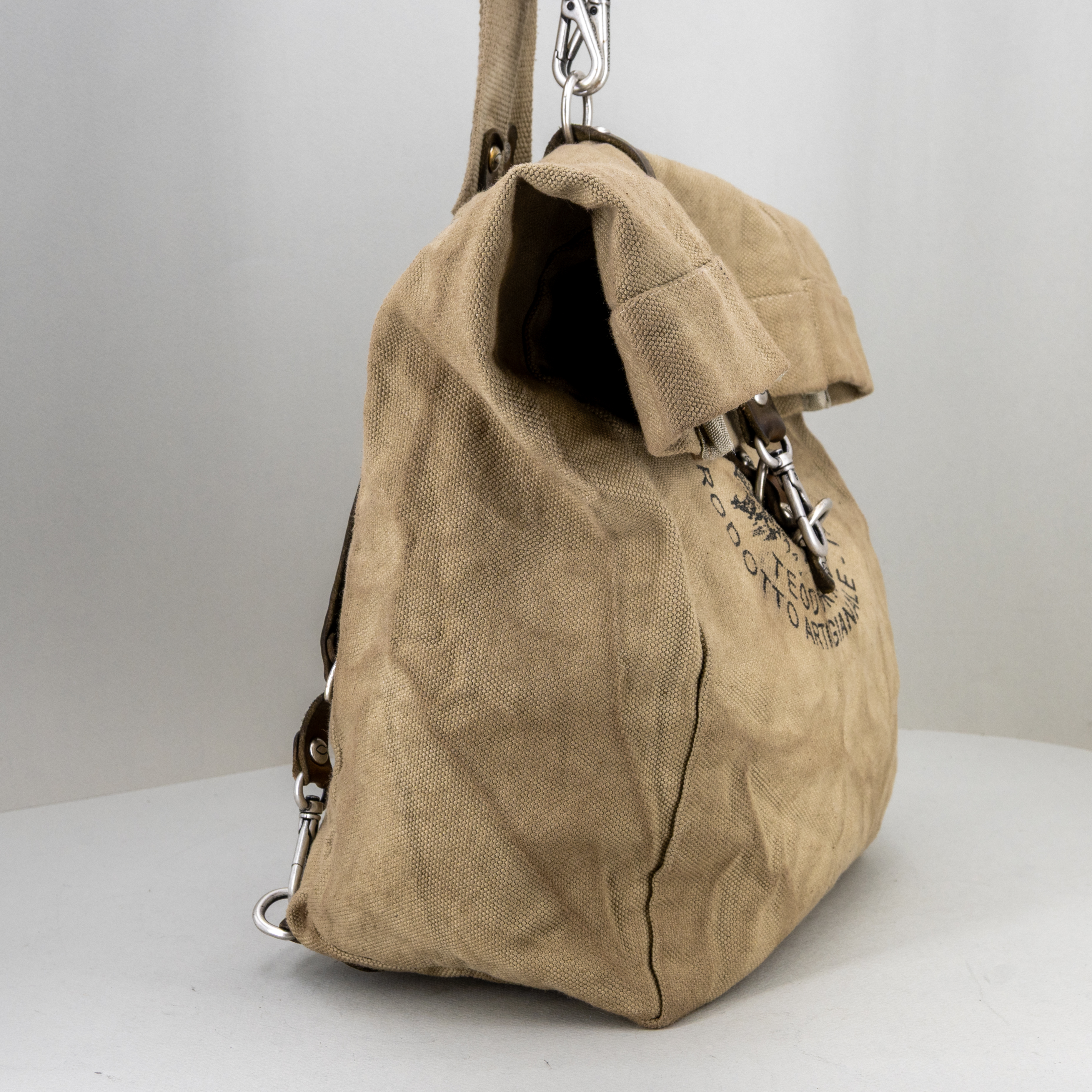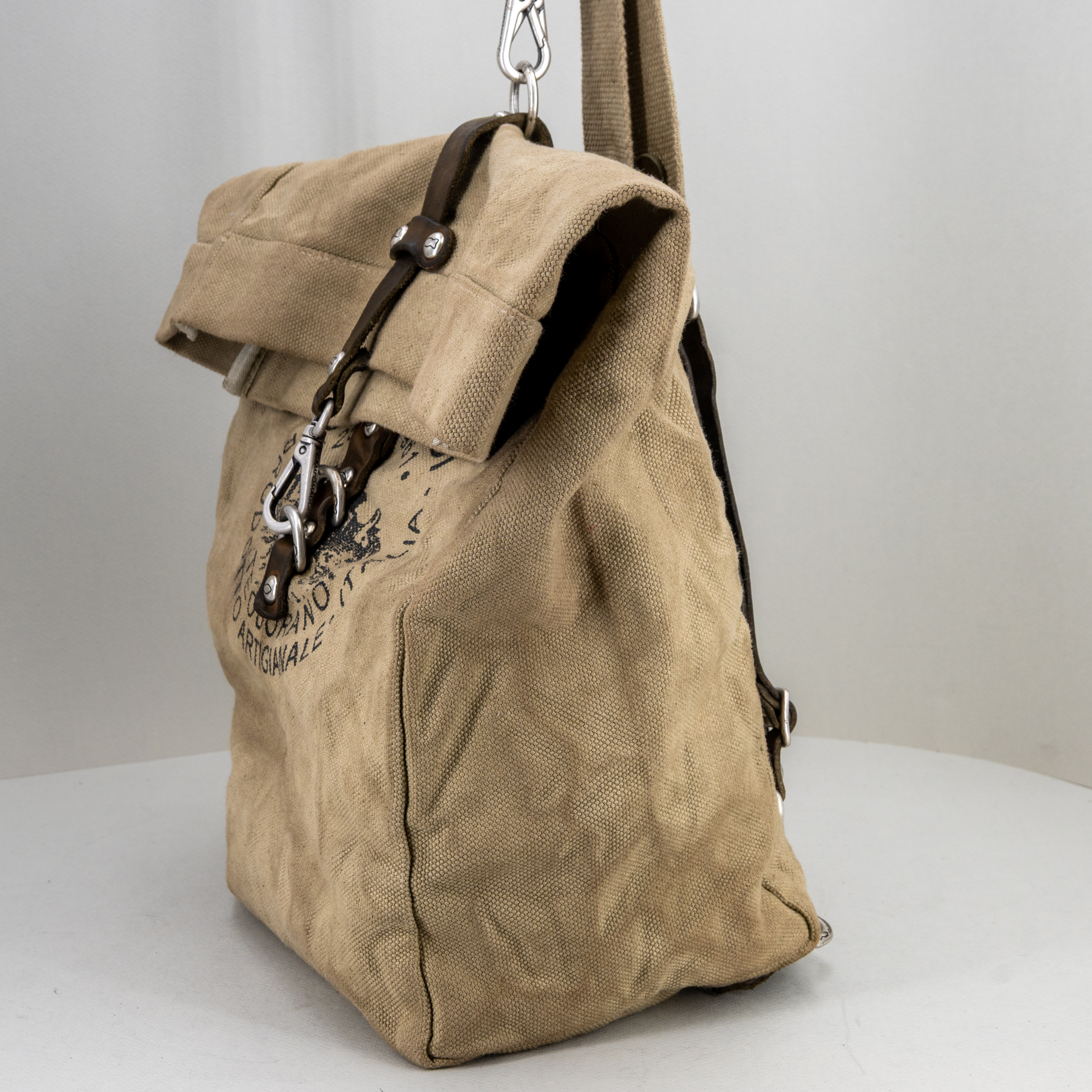 Chiusura superiore a sacco e spallacci in tela e pelle che possono trasformare lo zaino in una pratica borsa lavoro tracolla.