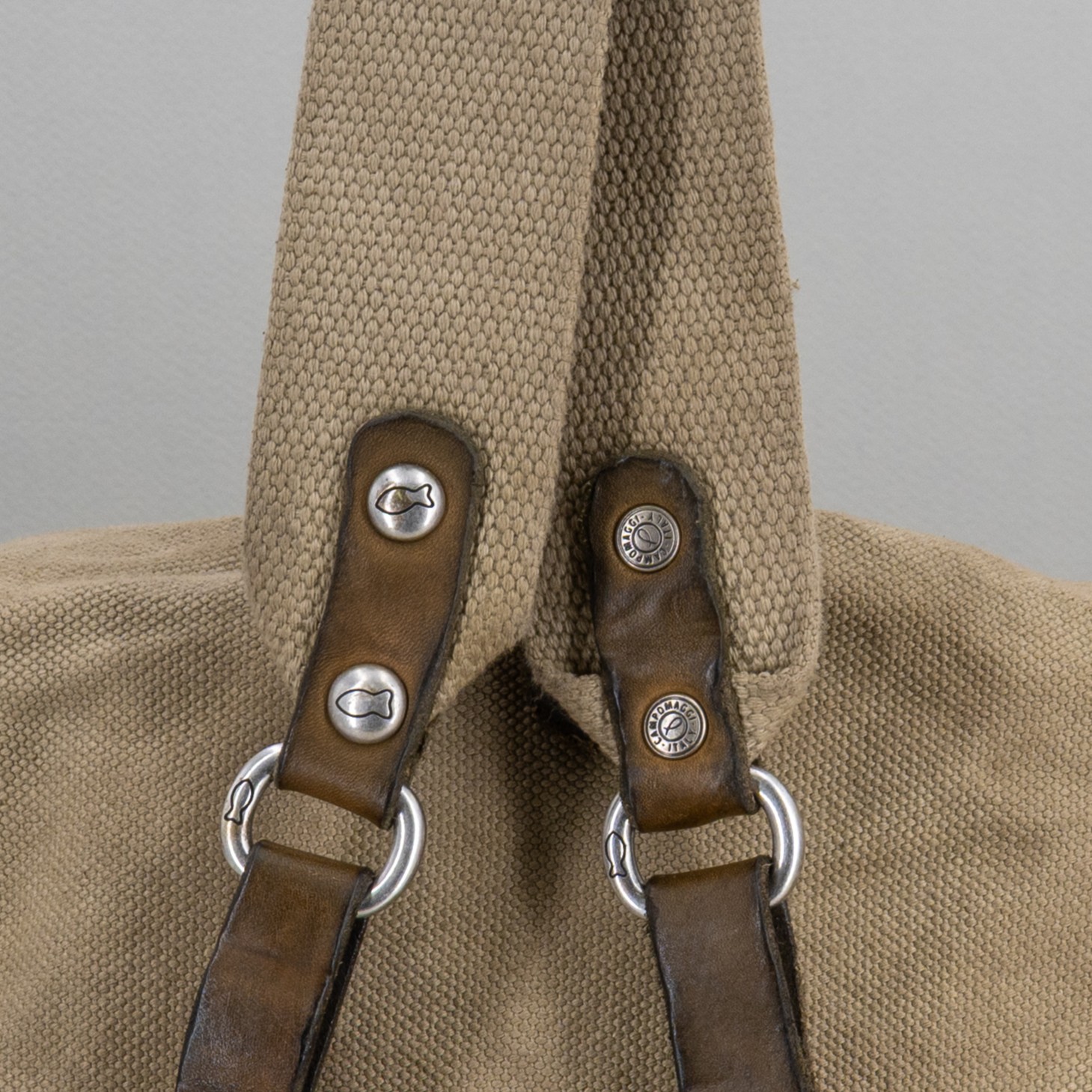 Bellissimo e pratico zaino di Campomaggi in tela canva resistente colre naturale.