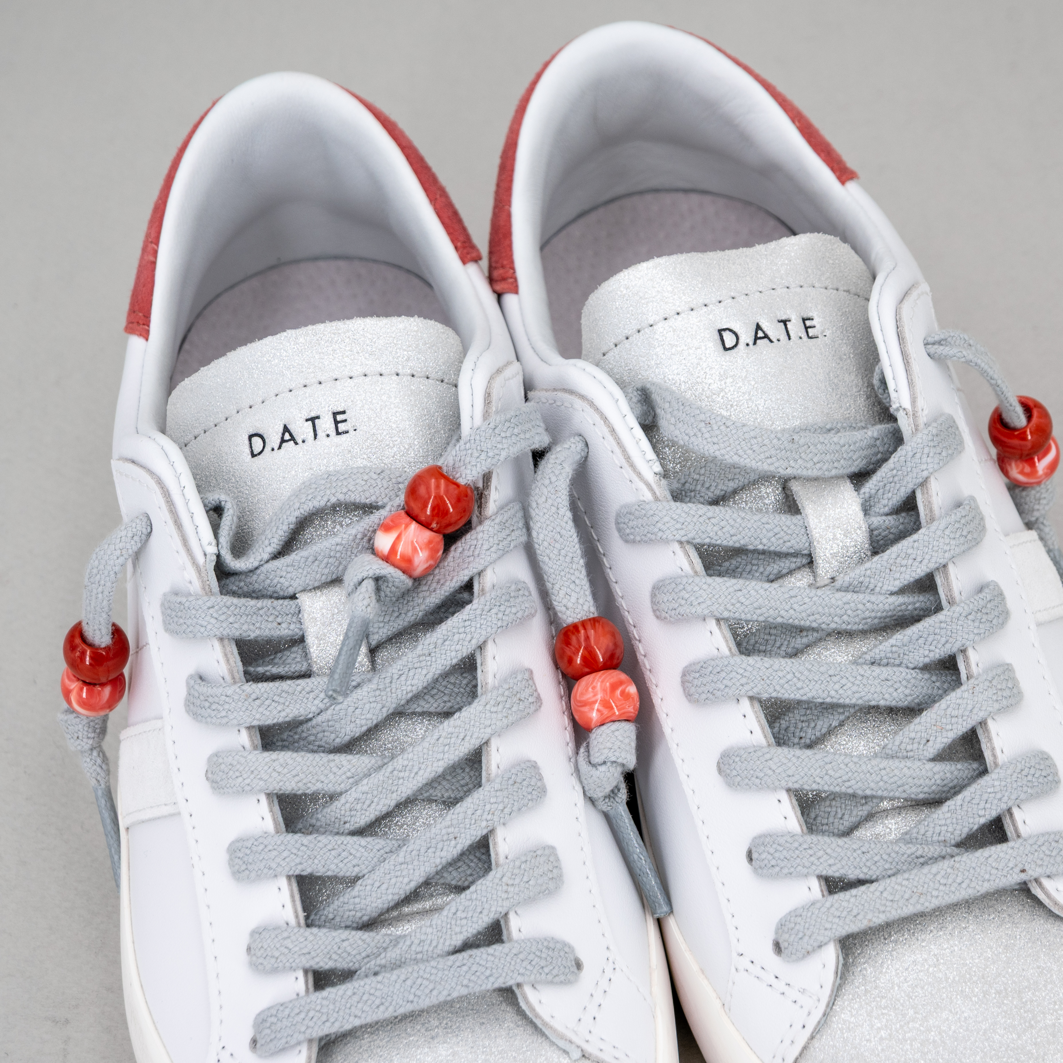 In pelle bianca con dettagli suede corallo e linguetta glitterata.