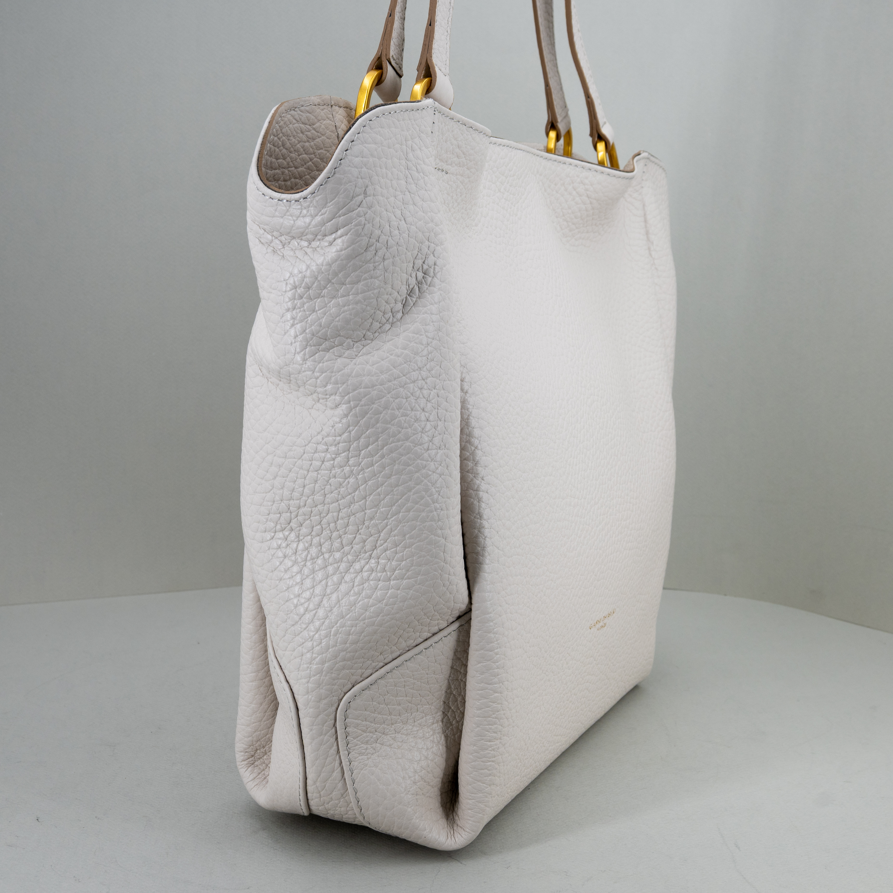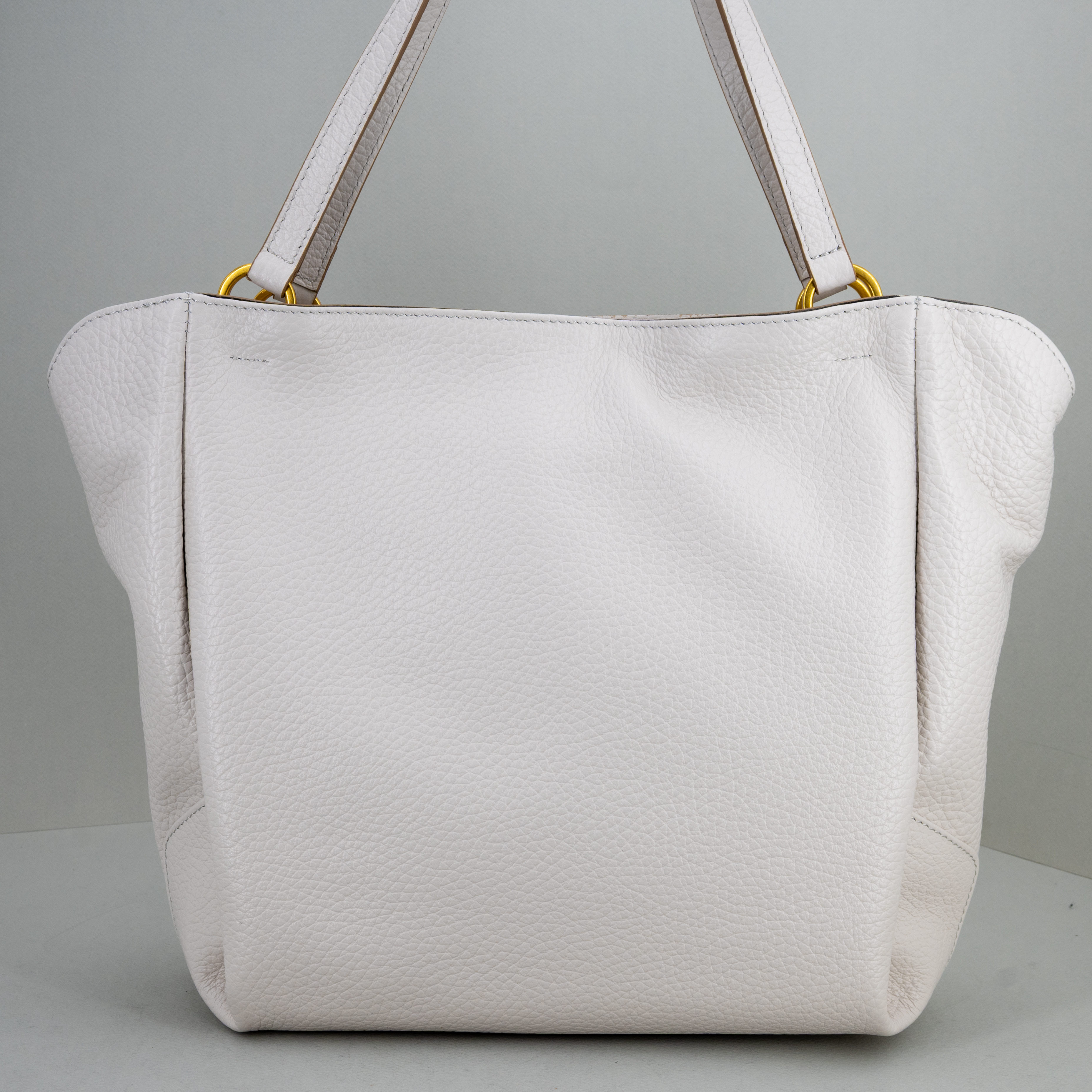 Realizzata in morbida pelle grana maxi, ha lunghi manici e la chiusura superiore con zip e bottone magnetico.