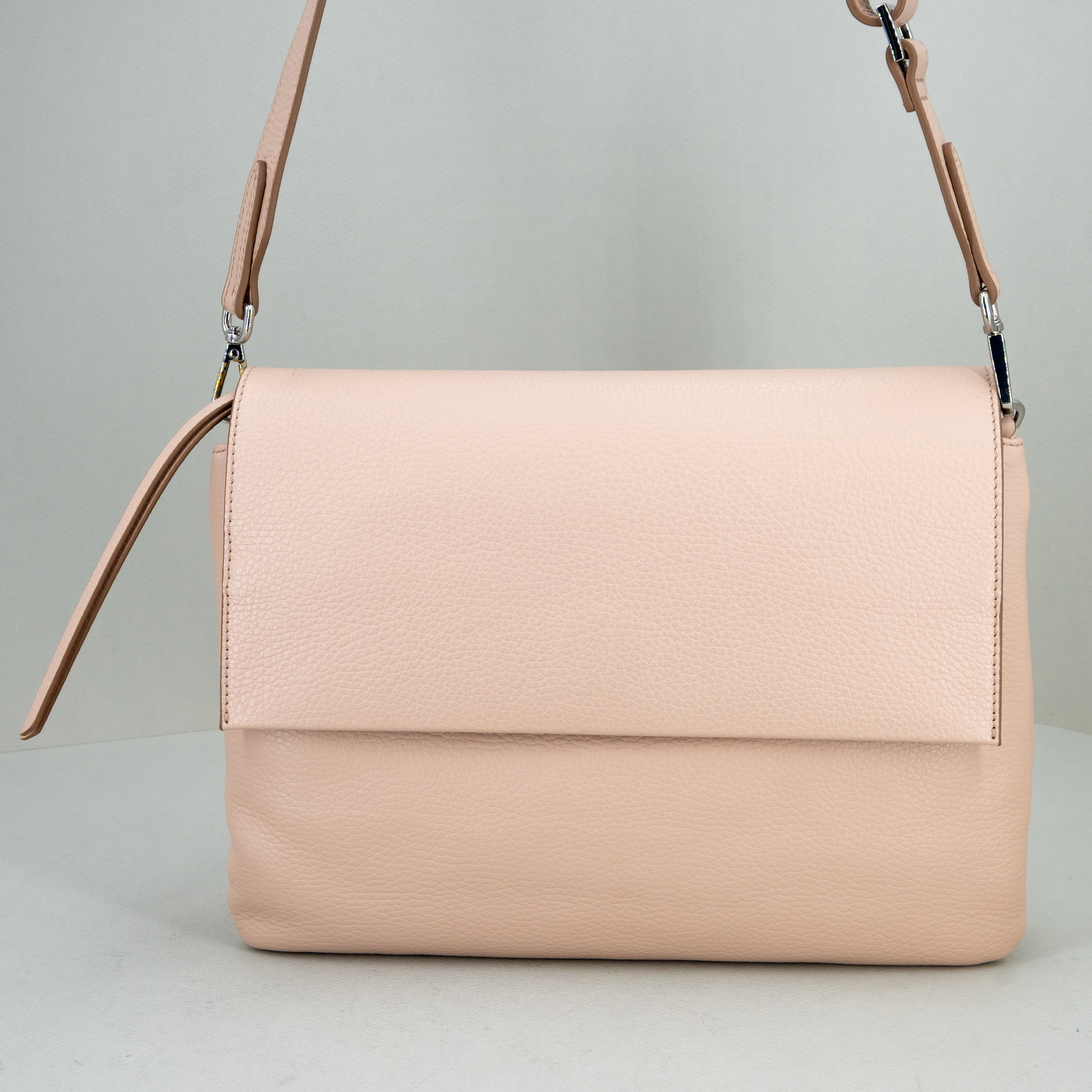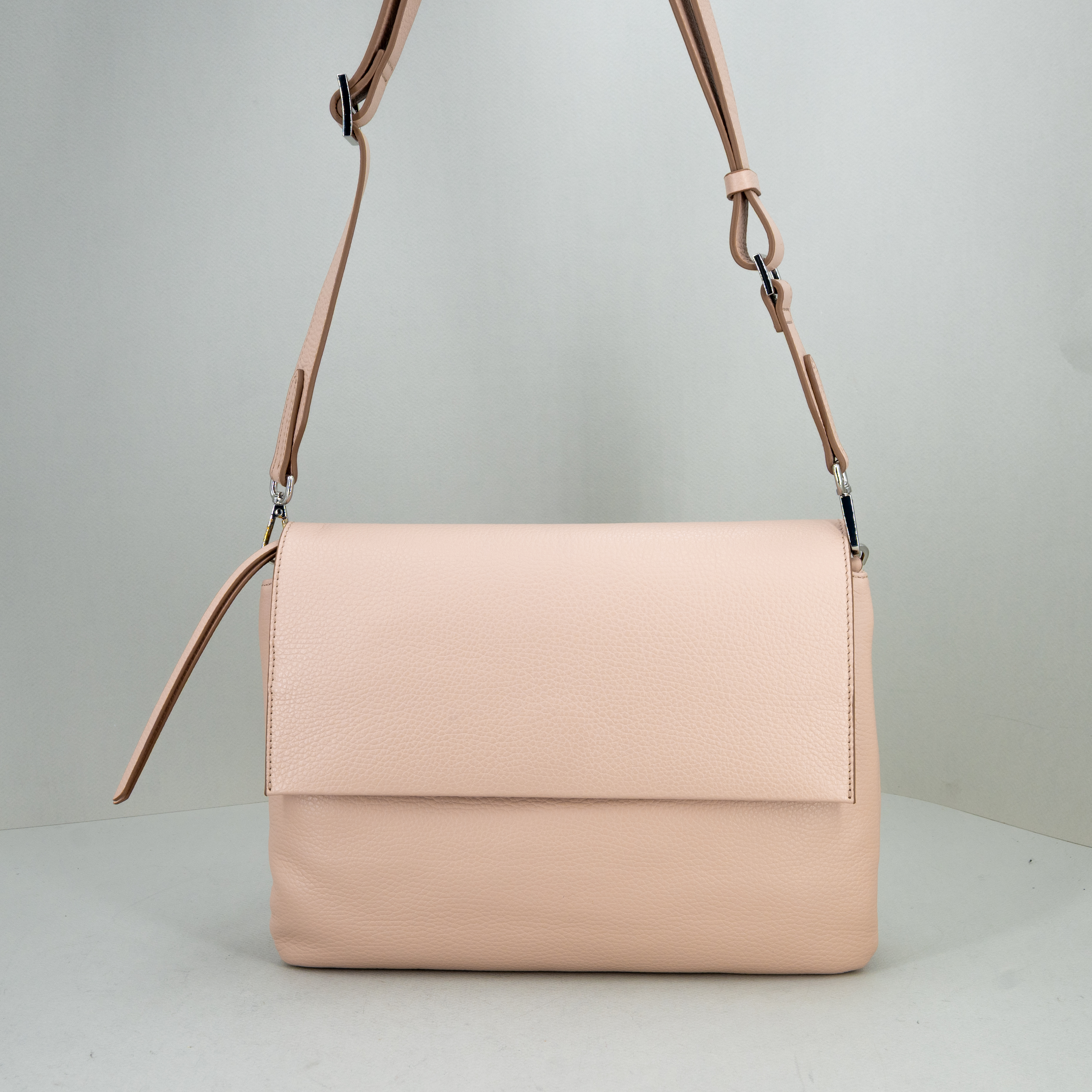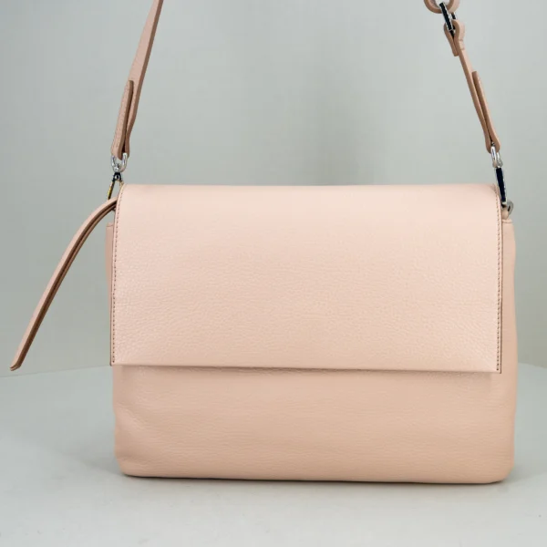 Realizzata in morbida pelle martellata, ha la patta e bottone magnetico nella parte superiore. Nuovo colore pink, rosa chiaro.
