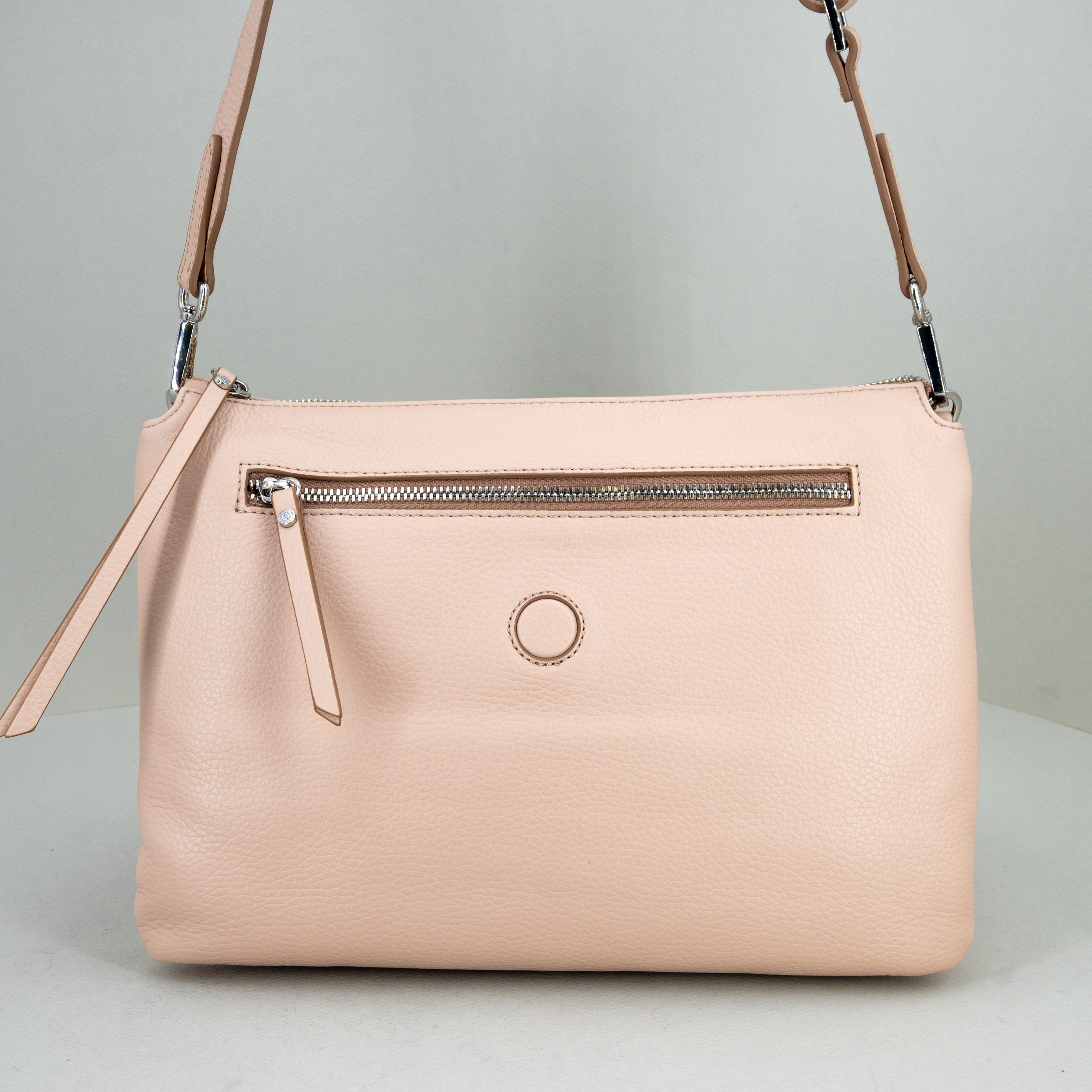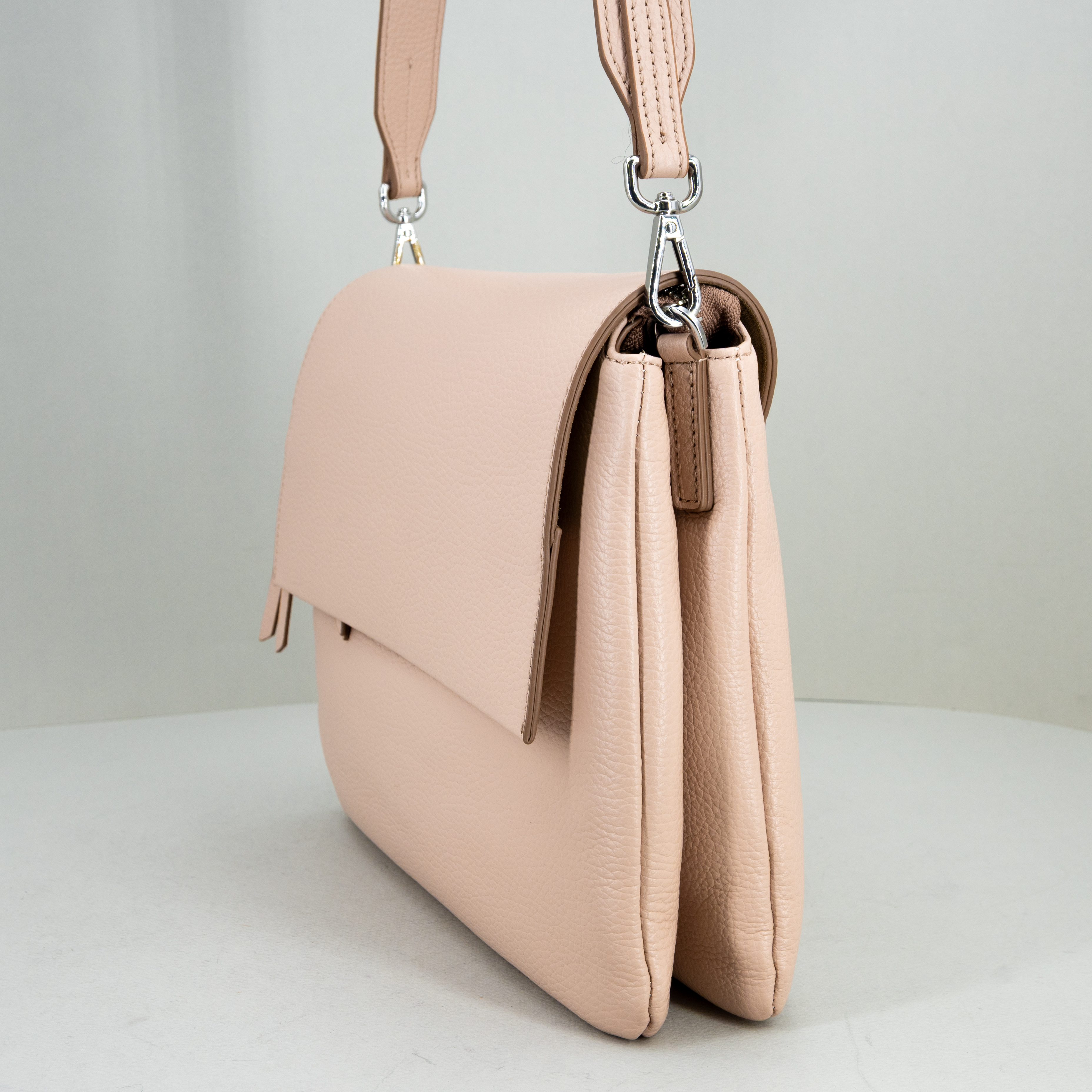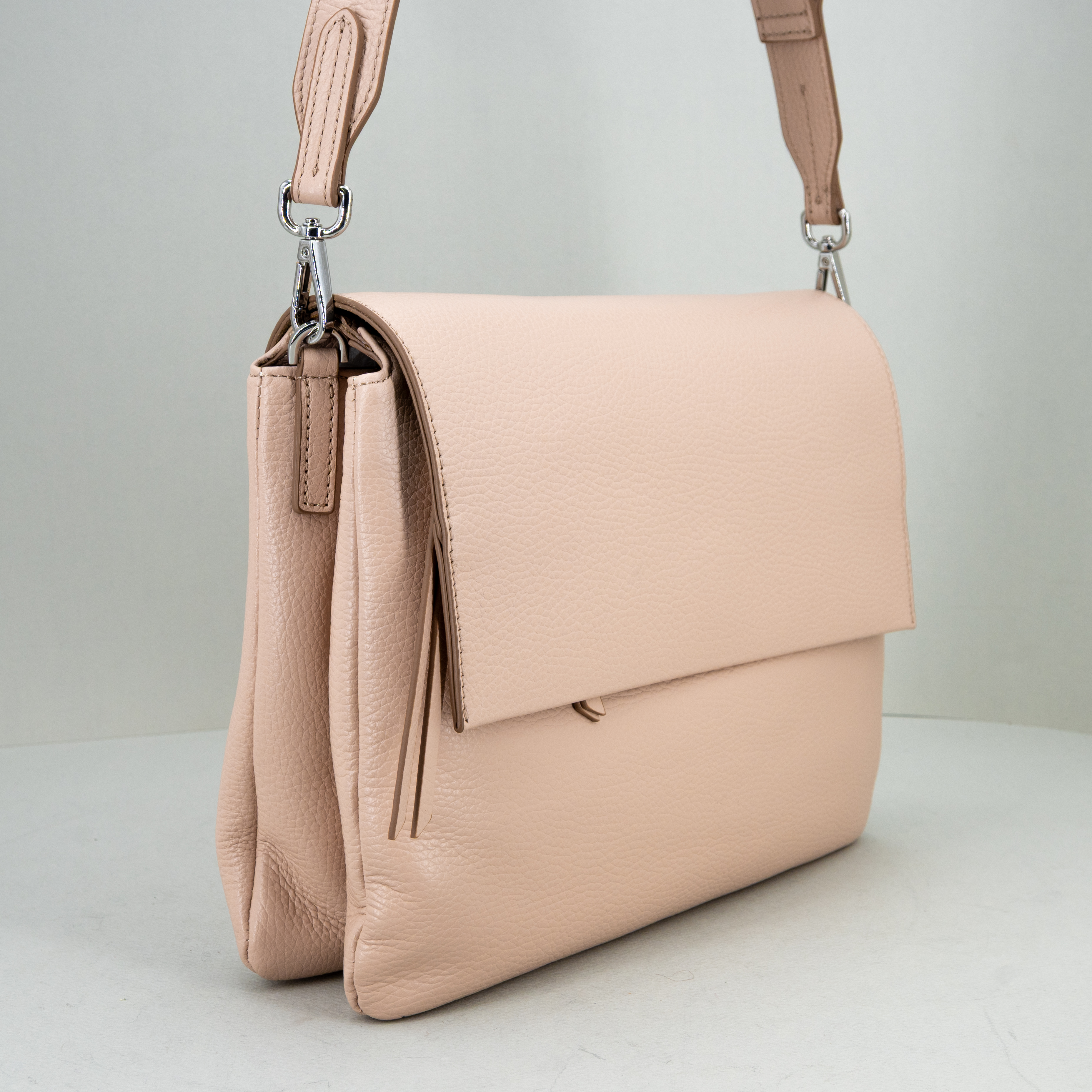 Realizzata in morbida pelle martellata, ha la patta e bottone magnetico nella parte superiore. Nuovo colore pink, rosa chiaro.