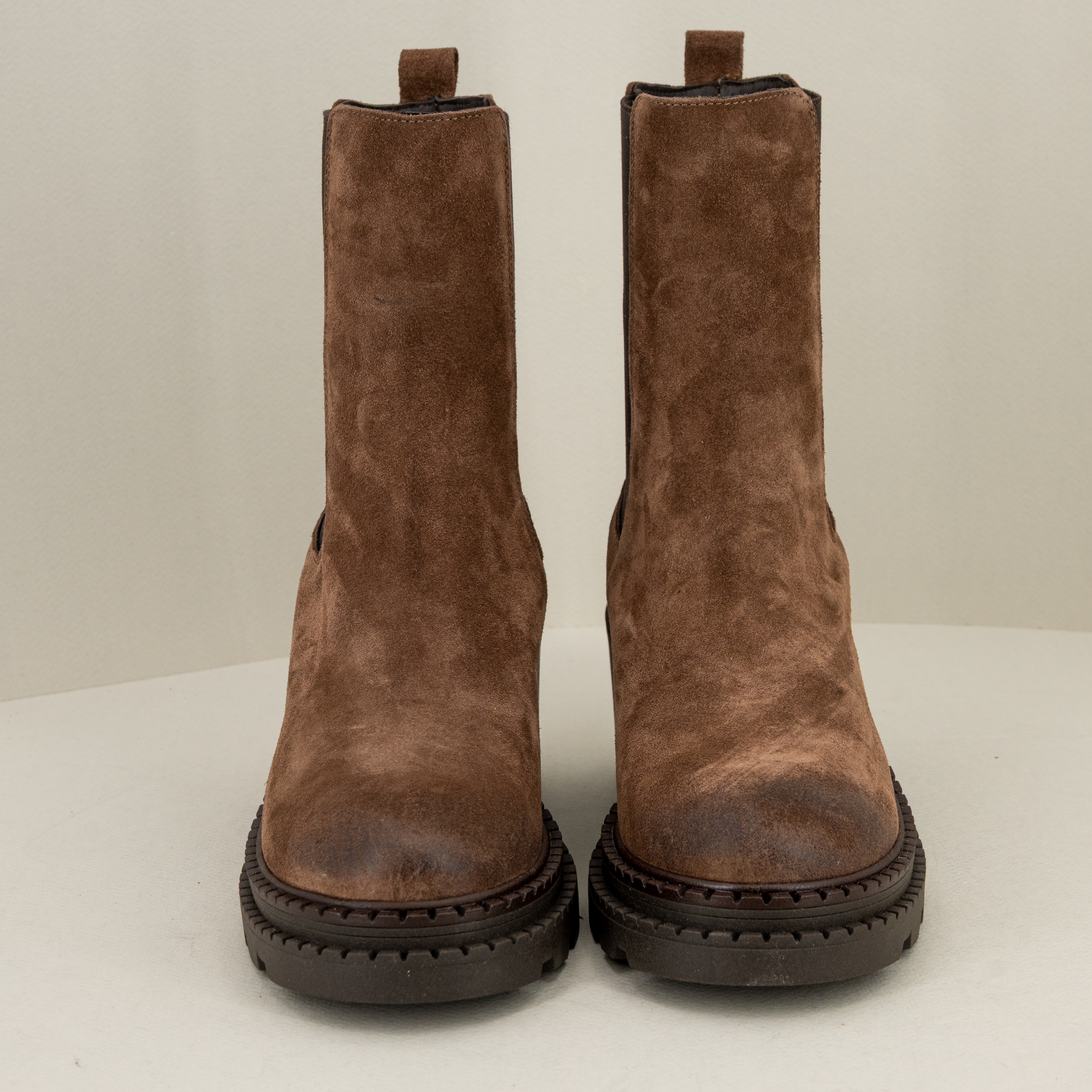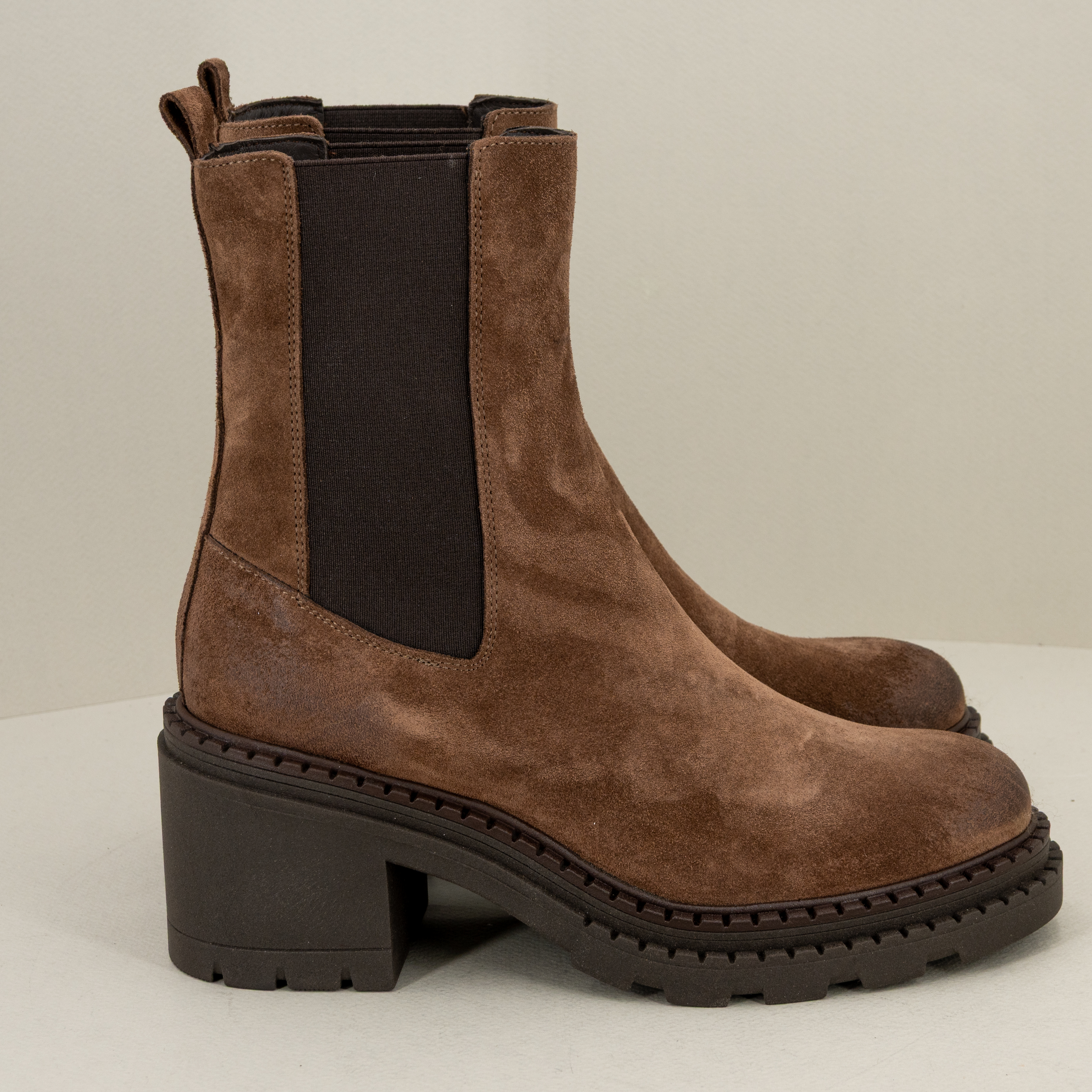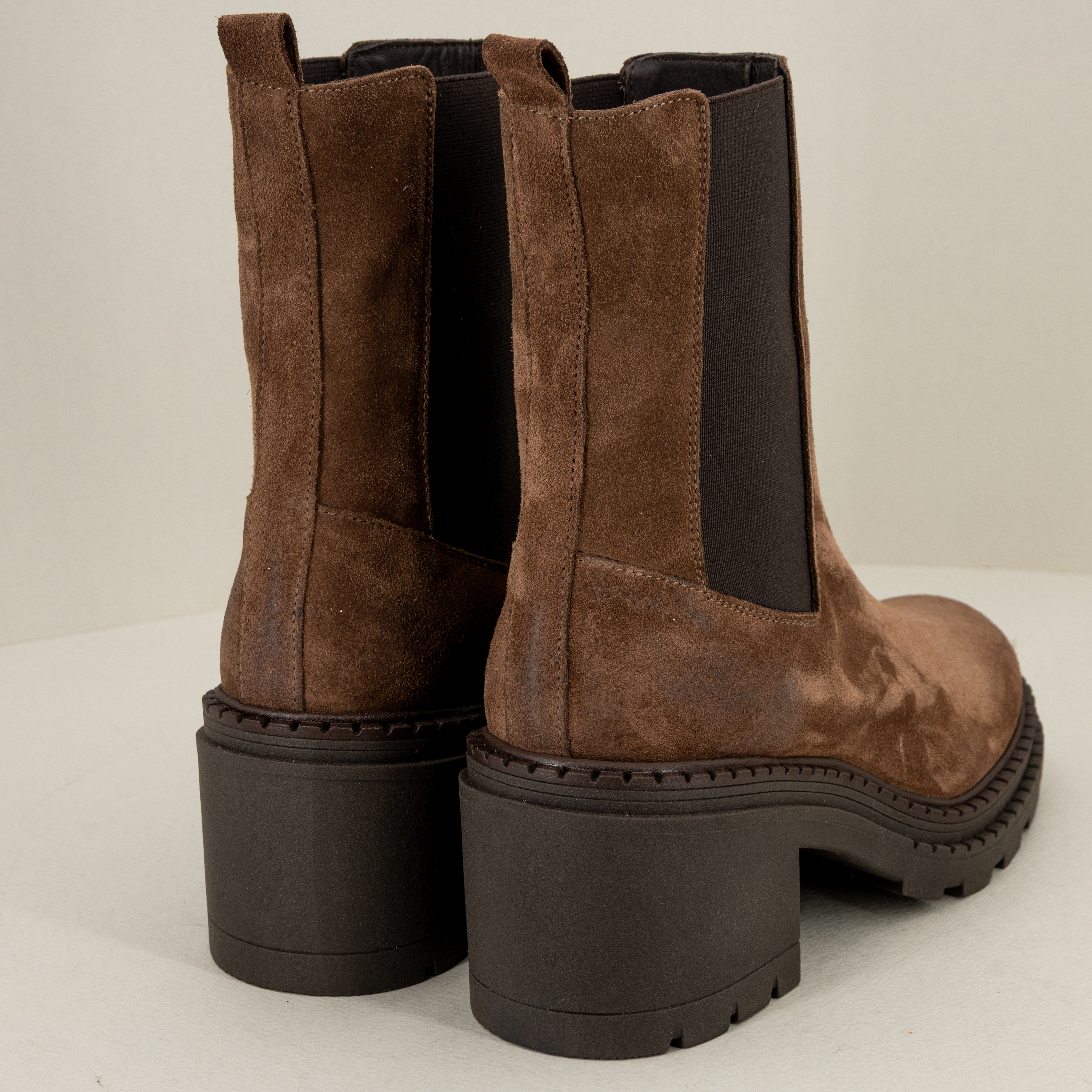 Il nuovo stivale donna di Les Tulipes è un  tronchetto stile beatles con tacco 6 cm in pelle scamosciata color marrone “espresso”.