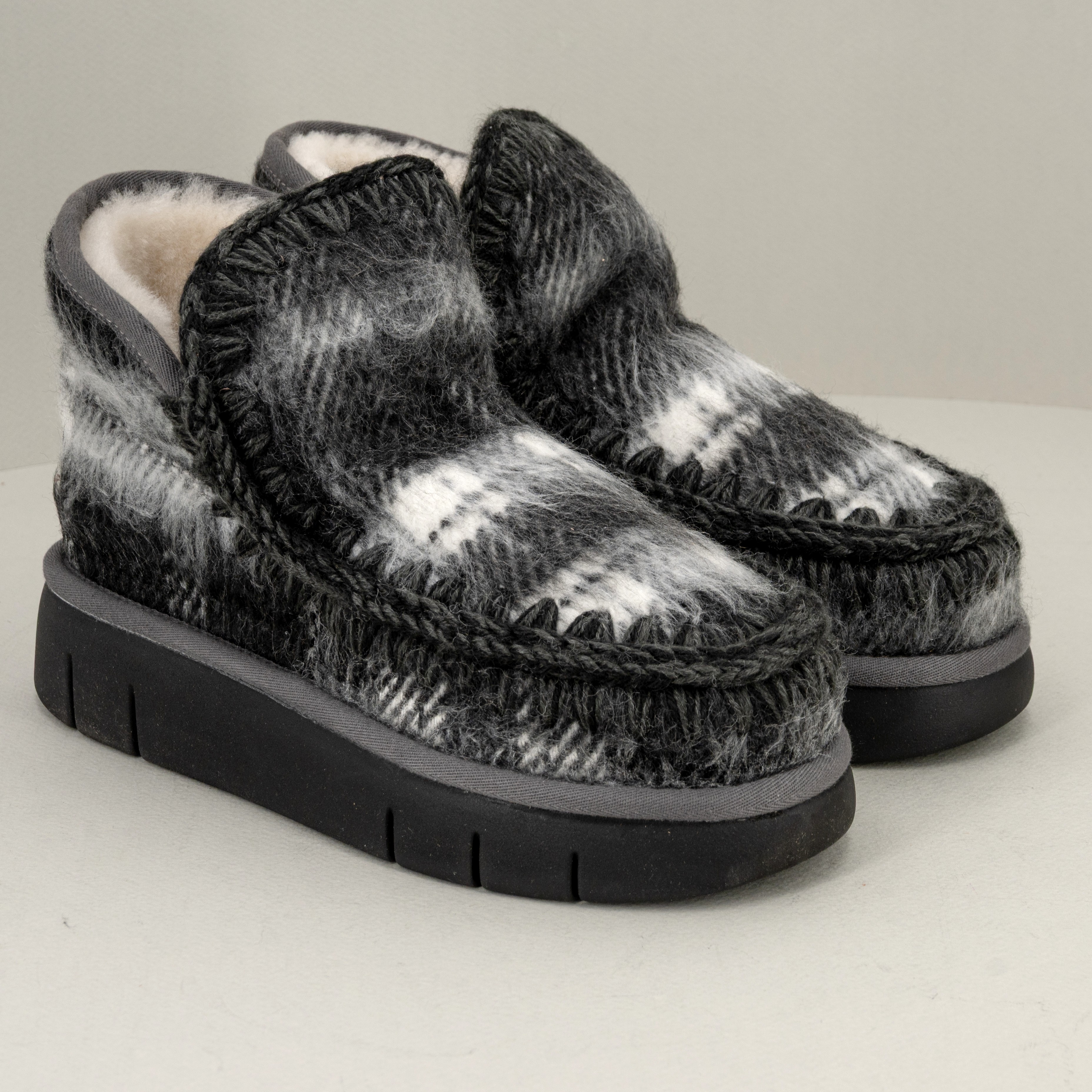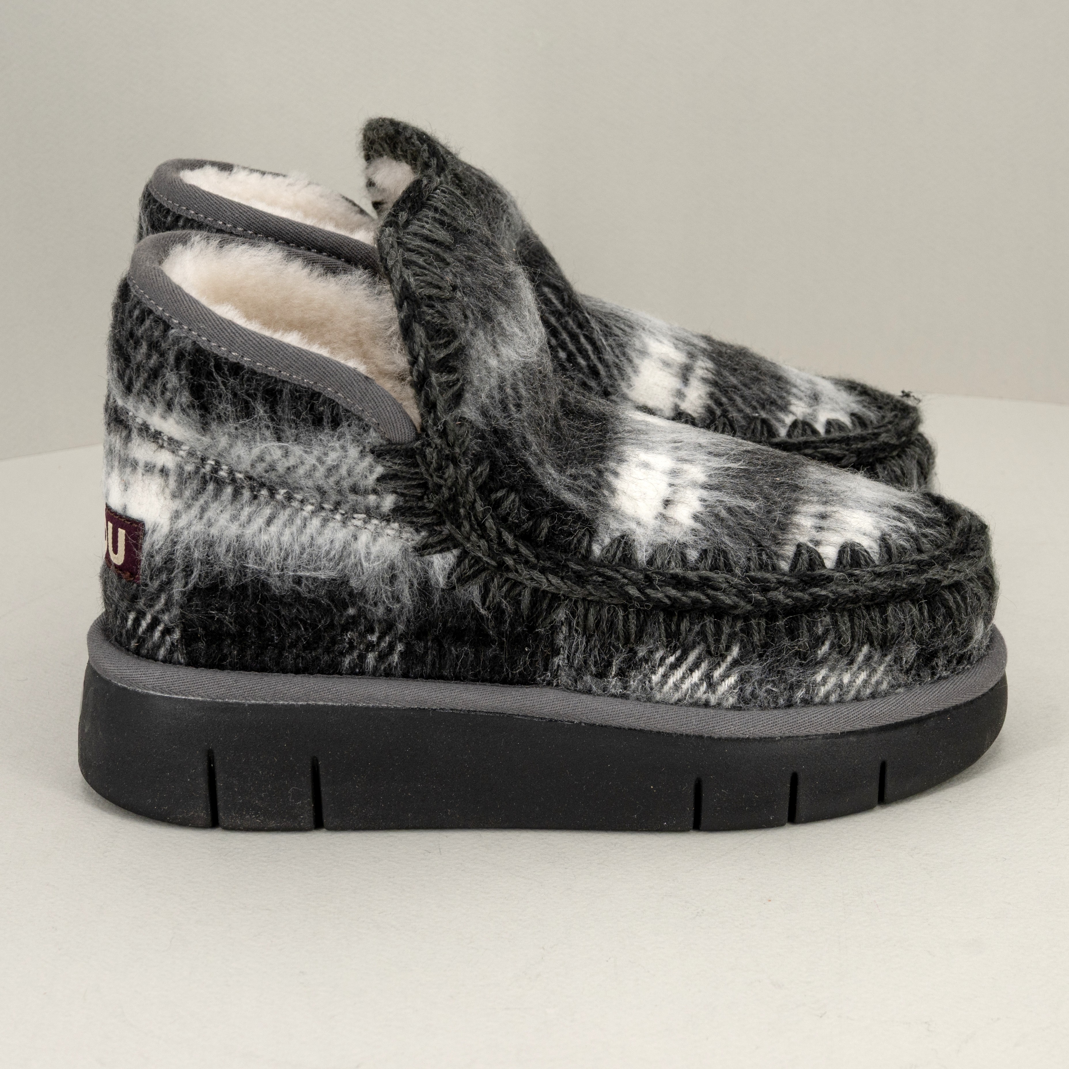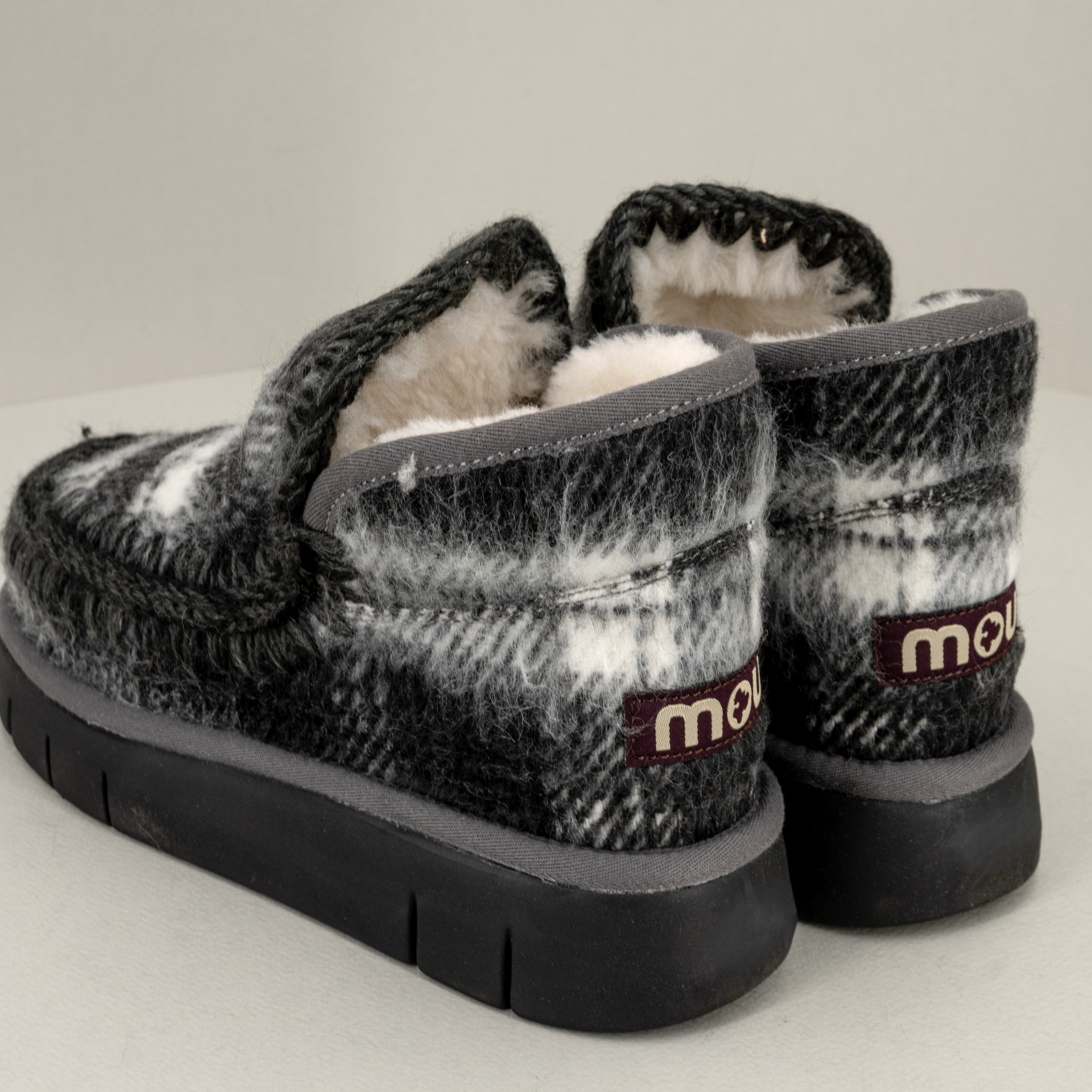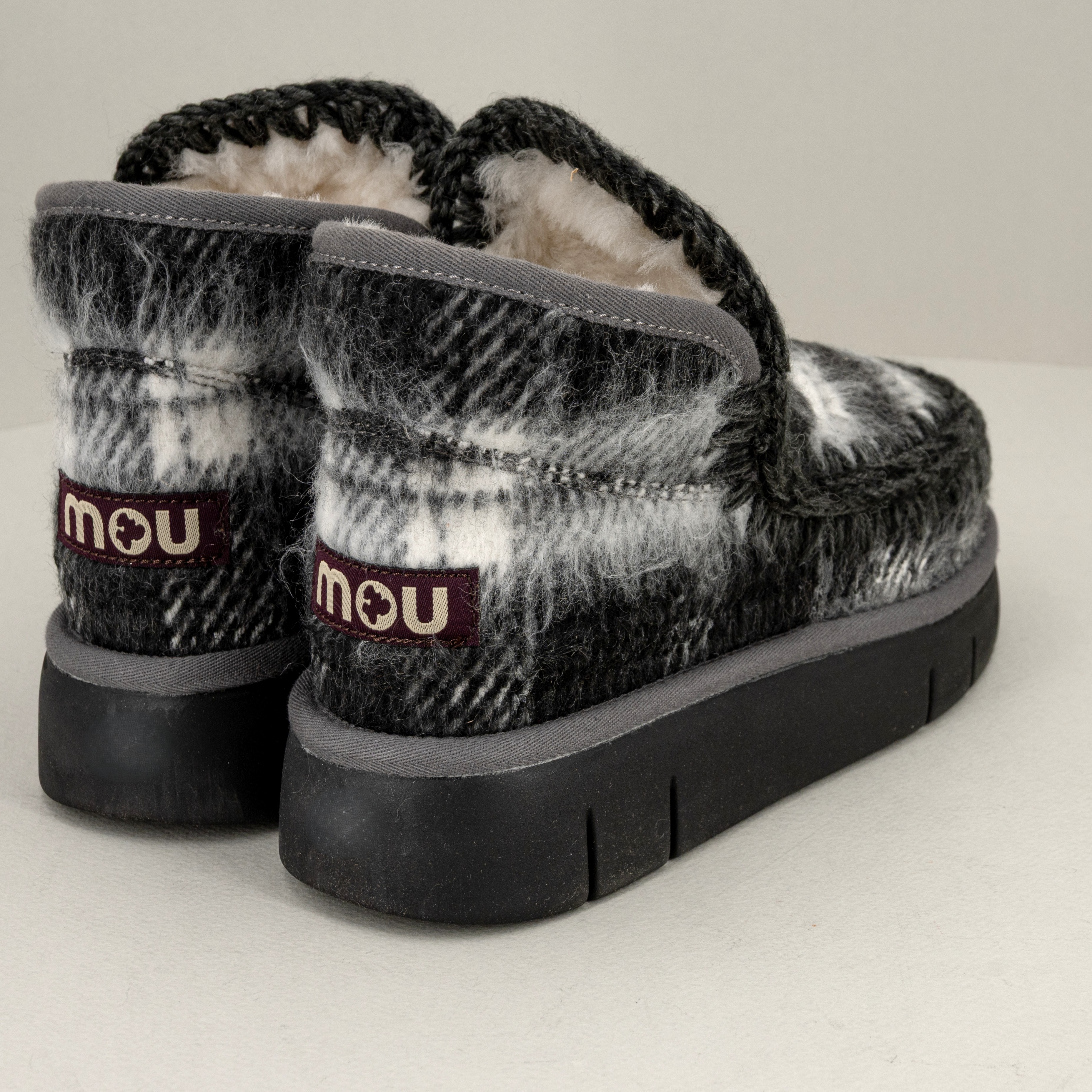 La linea Eskimo bounce sneaker si arricchisce di un nuovo modello per l’inverno 2025: realizzato a mano tessuto ispirato al plaid è in vera pelle di montone con dettagli all’uncinetto.
