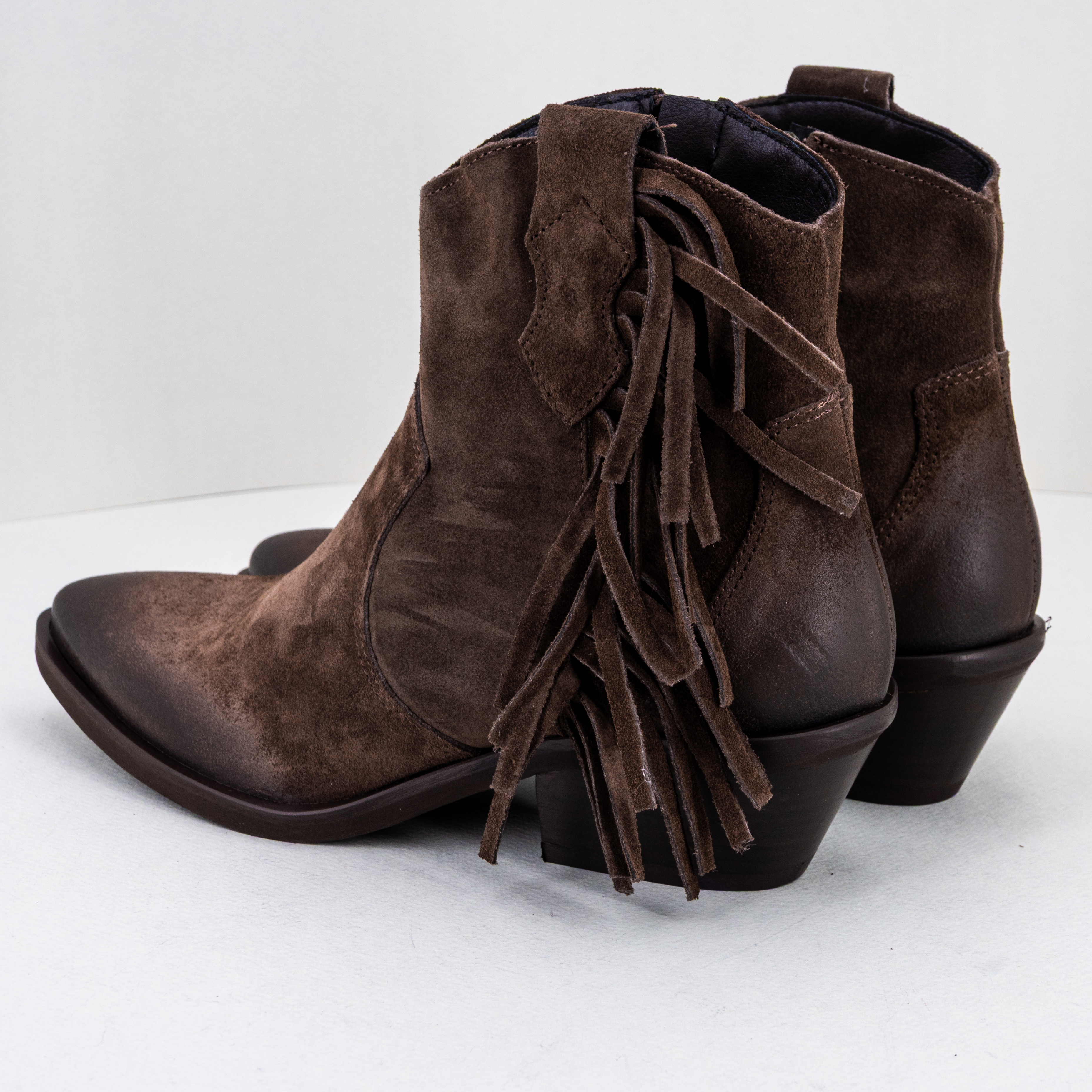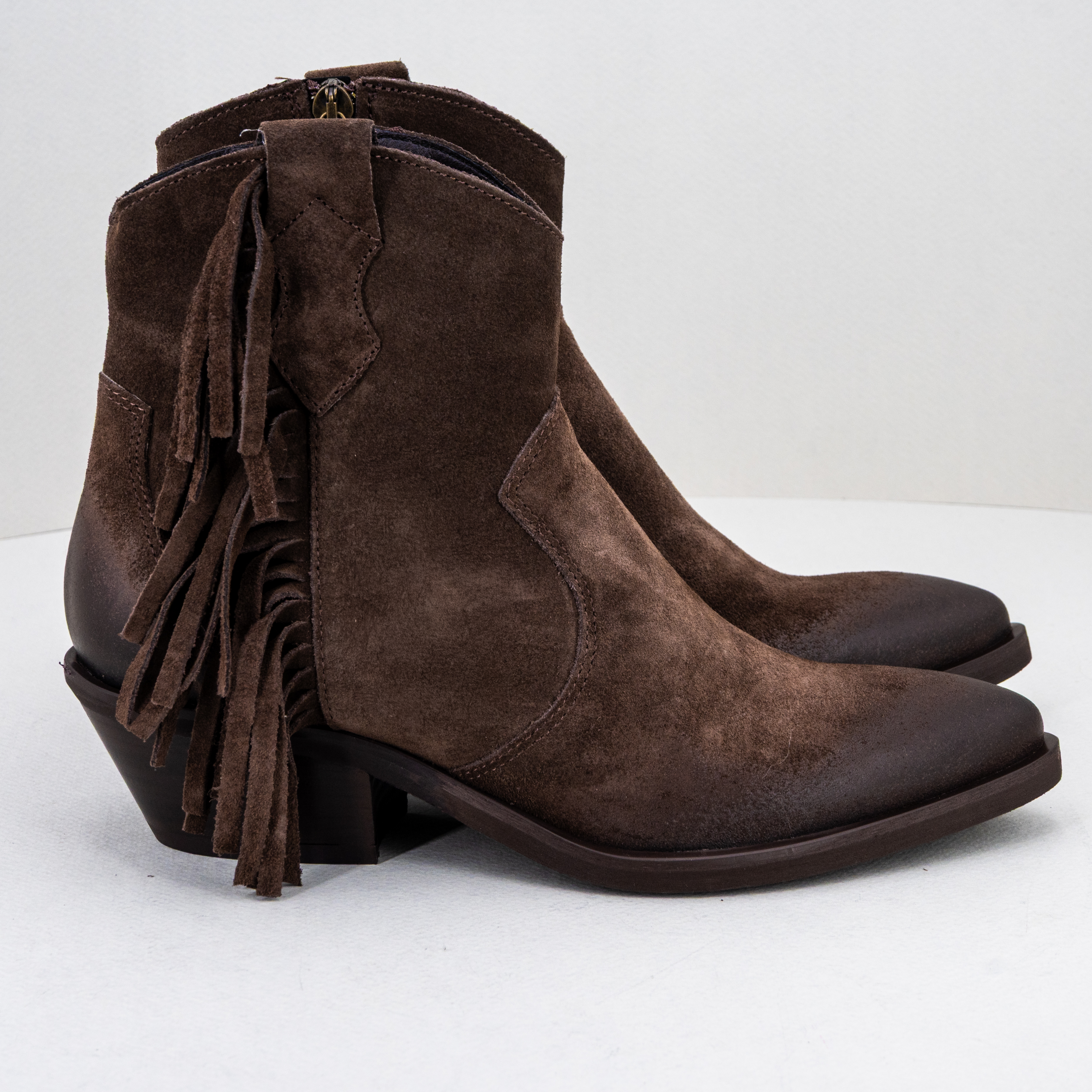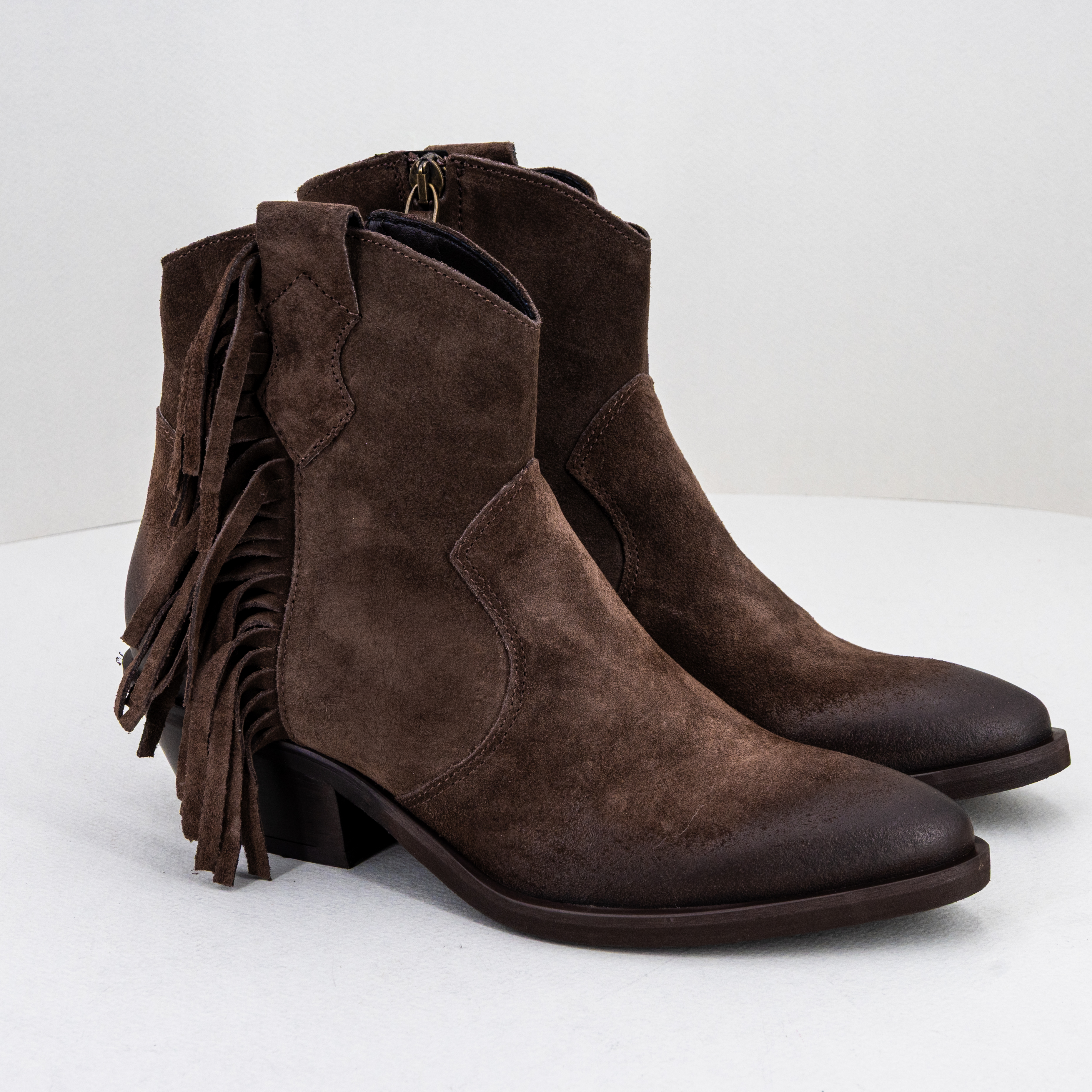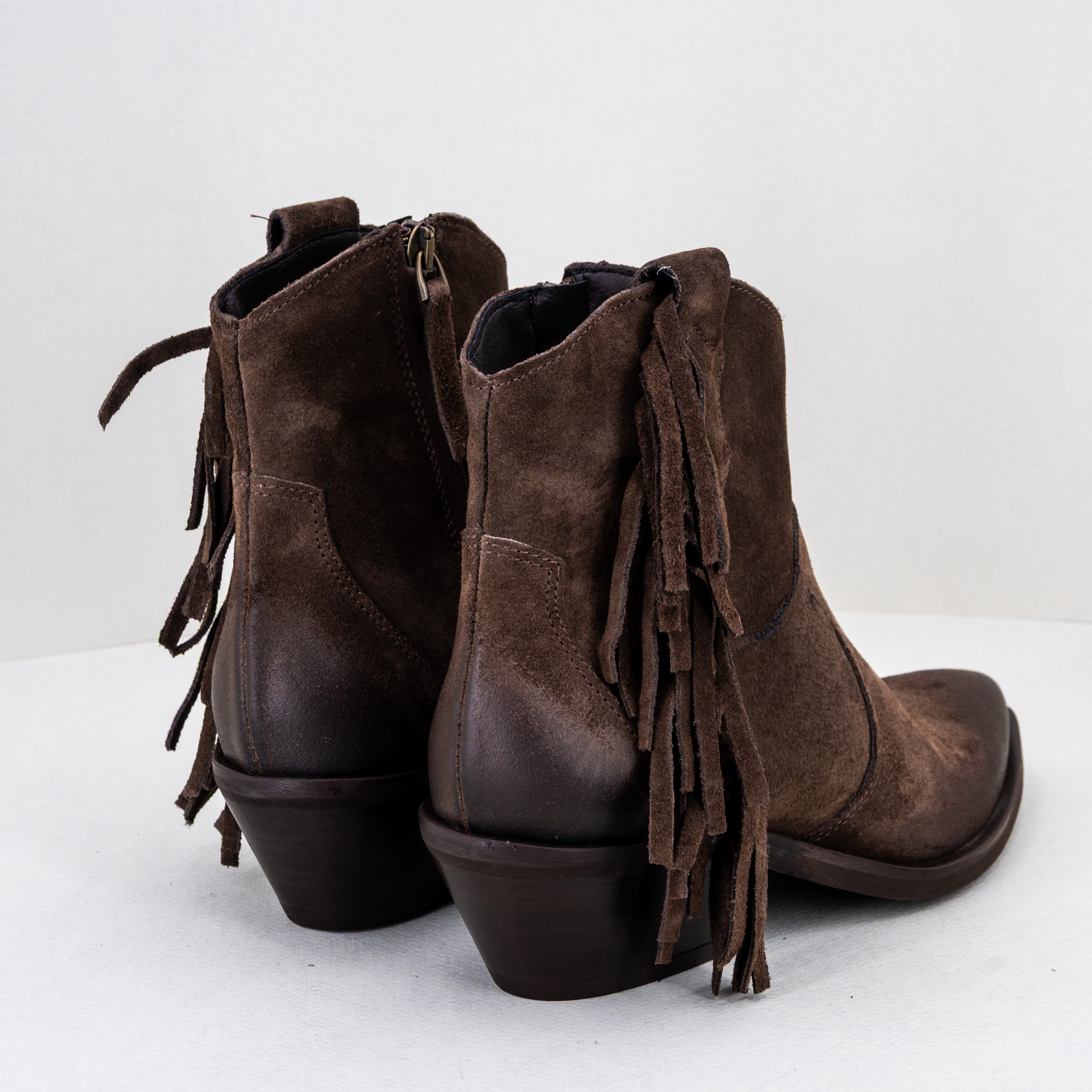 Stivaletto donna texano, basso color marrone con frange di Ovyè by Cristina Lucchi.