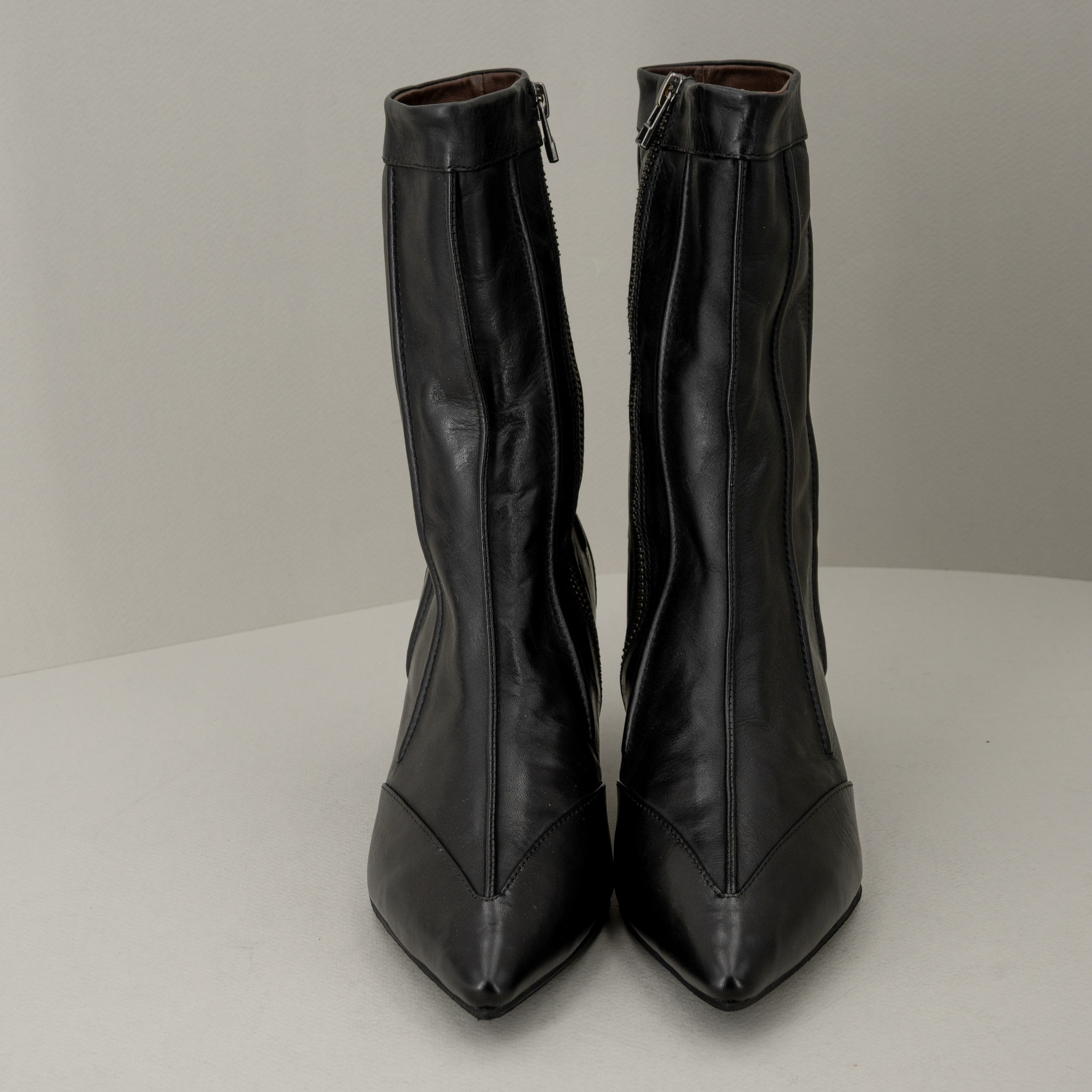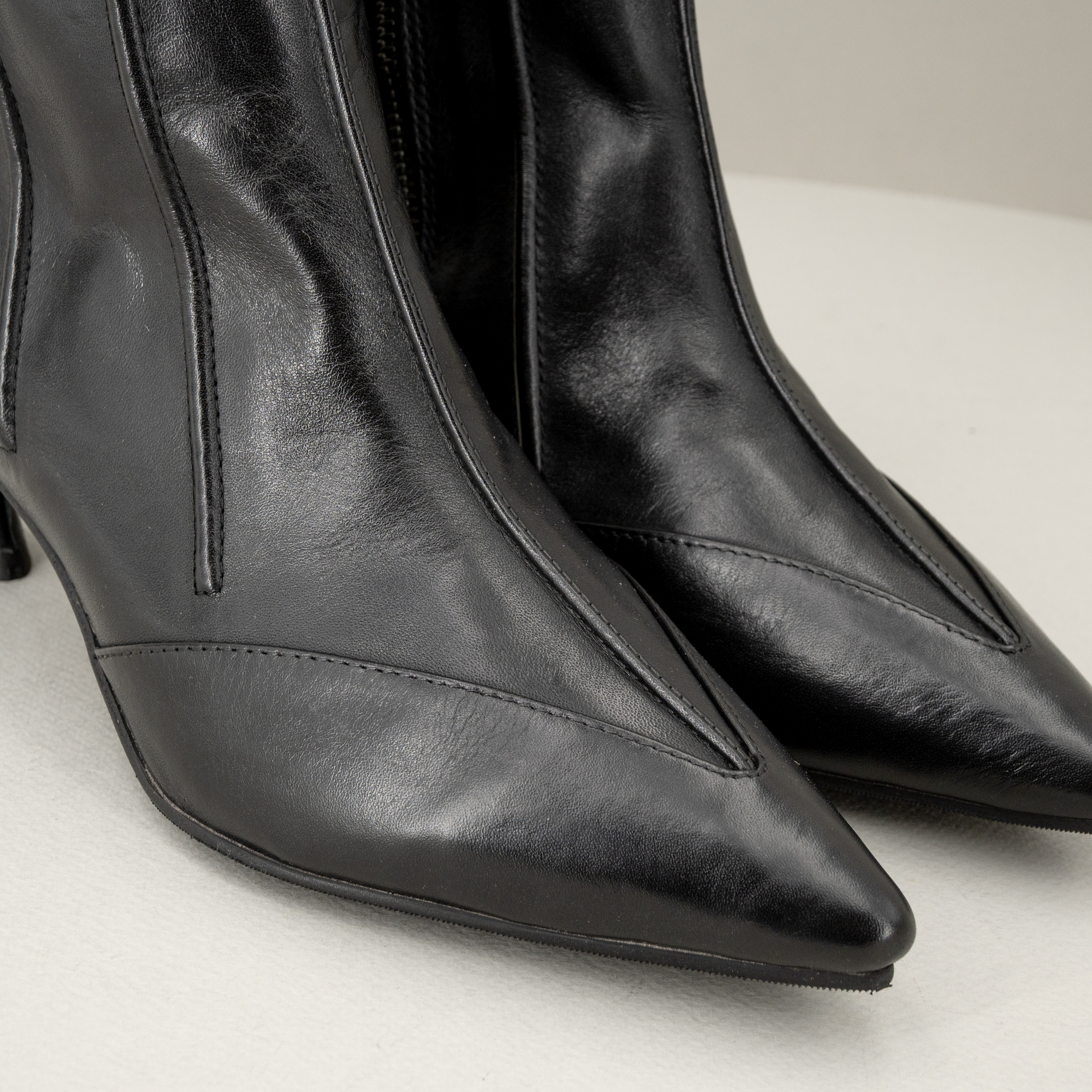 Stivaletto donna in vera e morbida pelle con tacco basso, punta e zip.