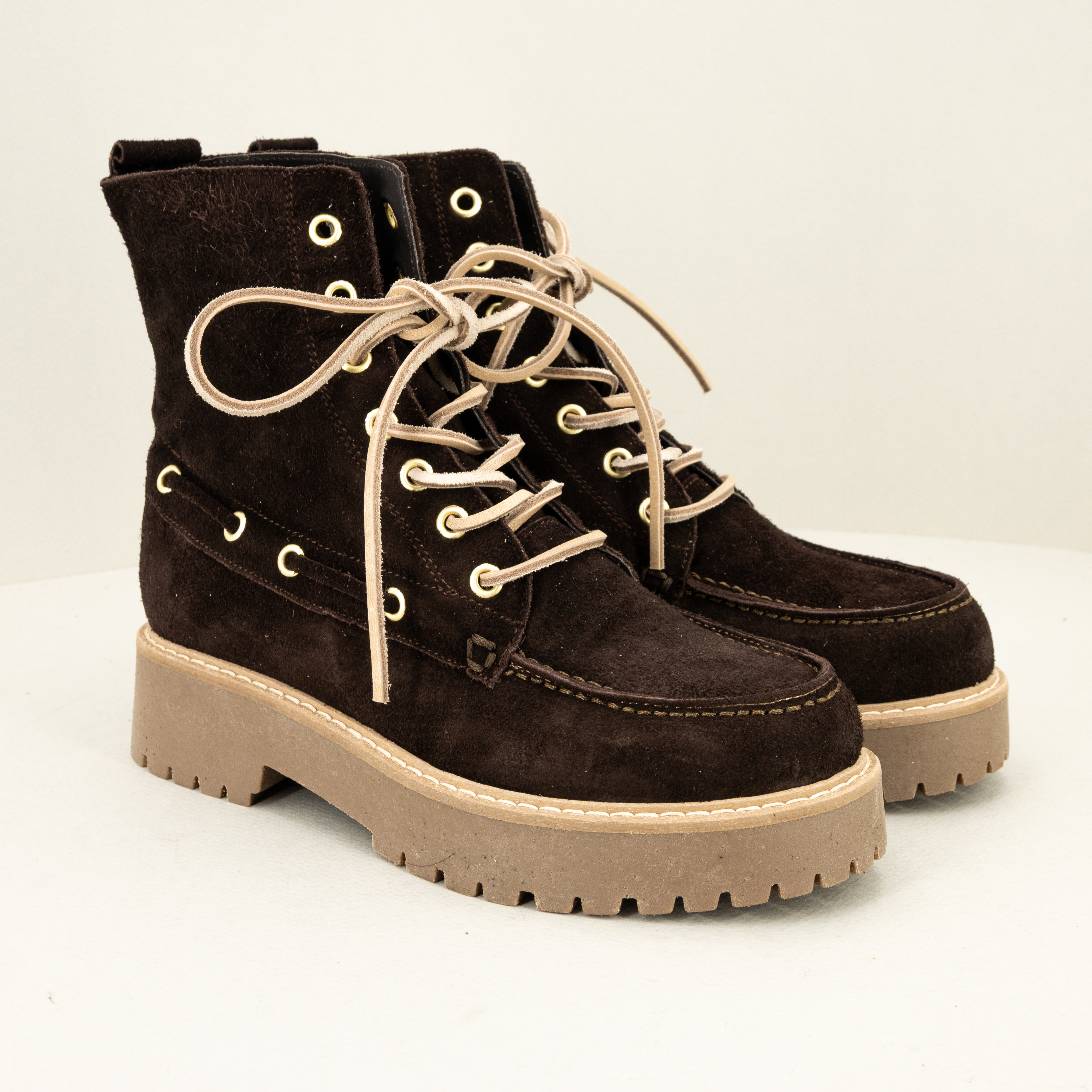 Bellissimo stivaletto alto da donna stringato in pelle di camoscio marrone scuro con suola alta.