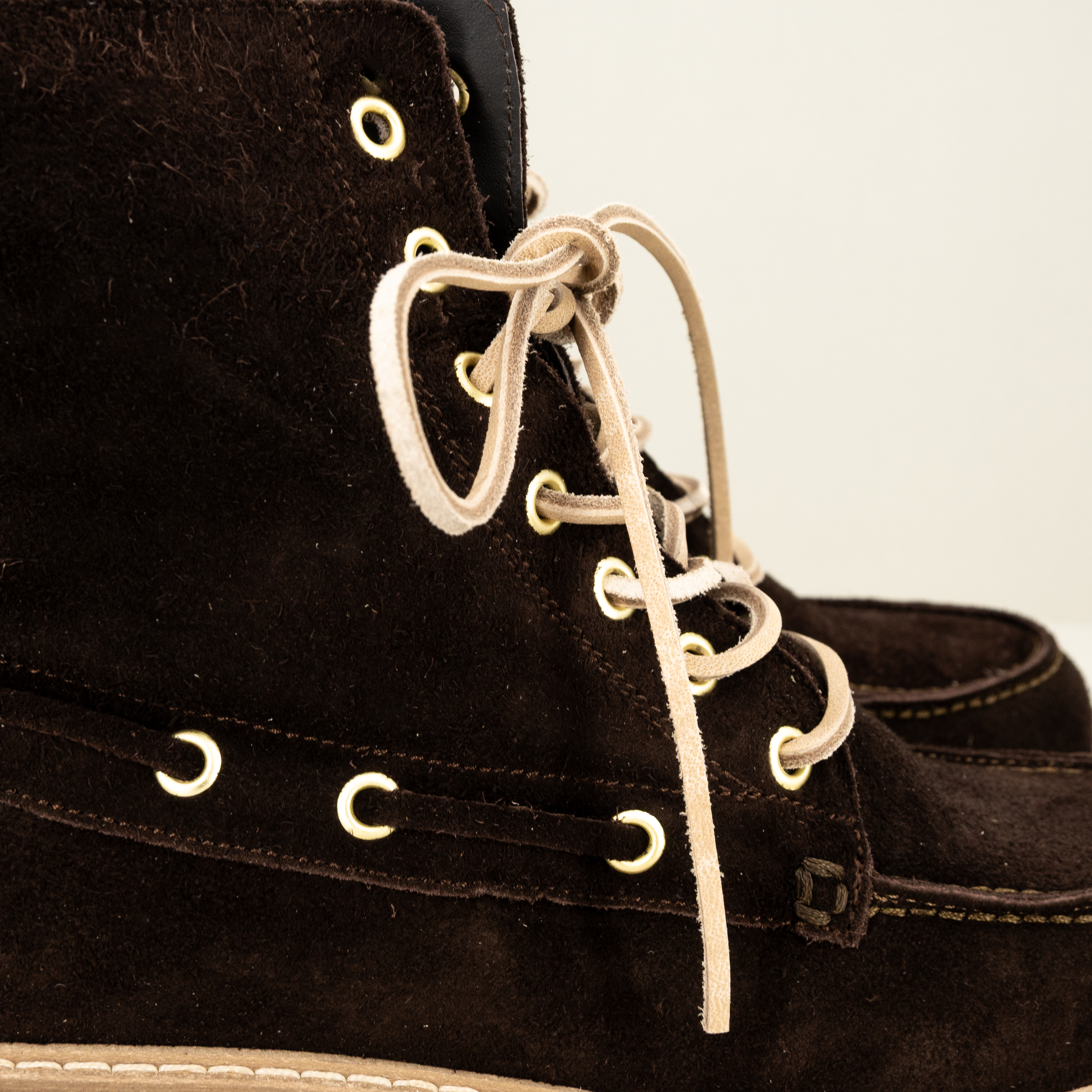 Comodo, calzata ampia e stile Timberland. Realizzato in Italia in pelle di camoscio trattata colore marrone scuro, ha lacci in cuoio.
